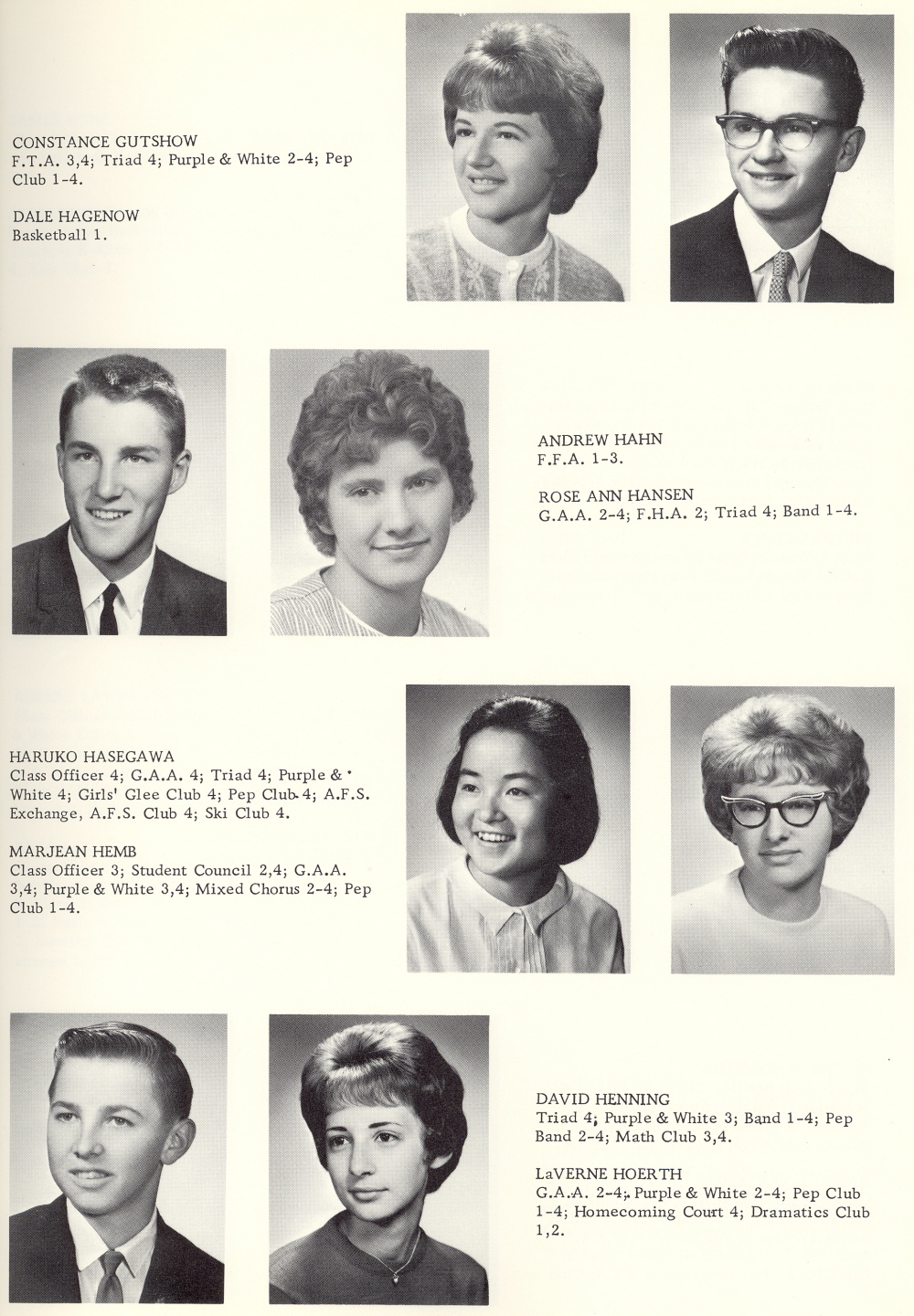 1964 Kiel High School, Page 3: Constance Gutshow, Dale Hagenow, Andrew Hahn, Rose Ann Hansen, Haruko Haswgawa, Marjean Hemb, David Henning, LaVerne Hoerth.