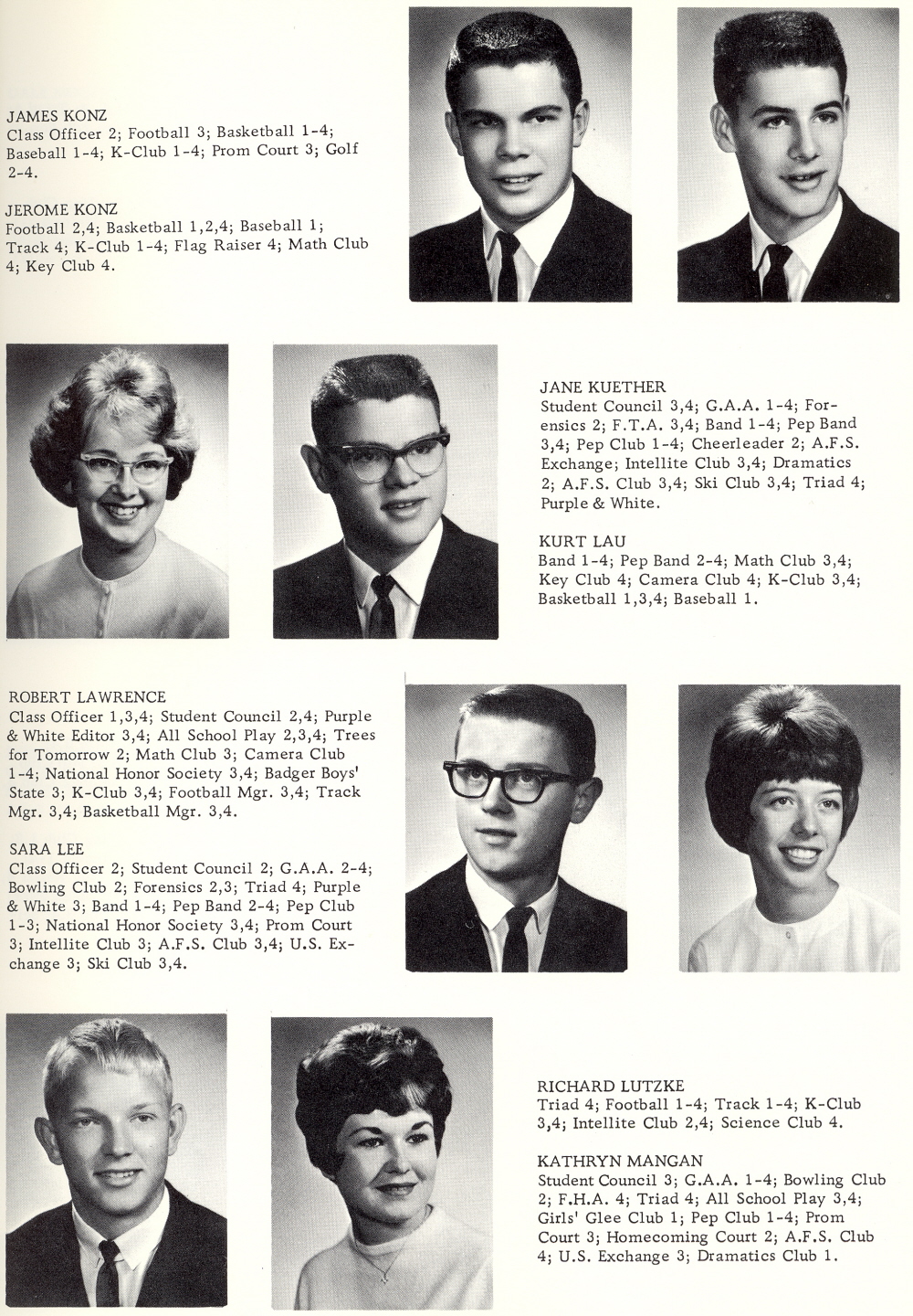 1964 Kiel High School, Page 5: James Konz, Jerome Konz, Jane Kuether, Kurt Lau, Robert Lawrence, Sara Lee, Richard Lutzke, Kathryn Mangan.