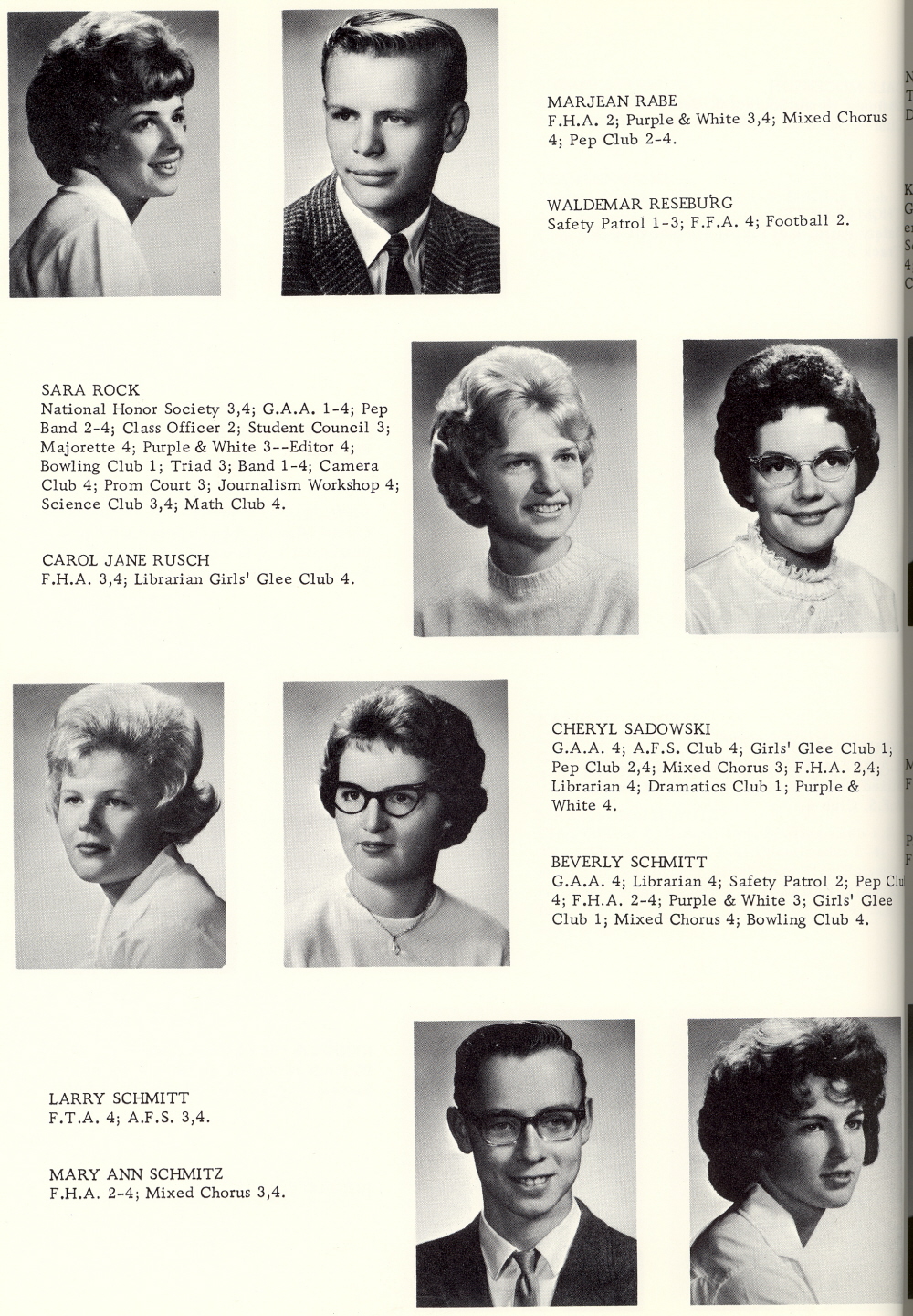 1964 Kiel High School, Page 8: Marjean Rabe, Waldemar Reseburg, Sara Rock, Carol Jane Rusch, Cheryl Sadowski, Beverly Schmitt, Larry Schmitt, Mary Ann Schmitz.
