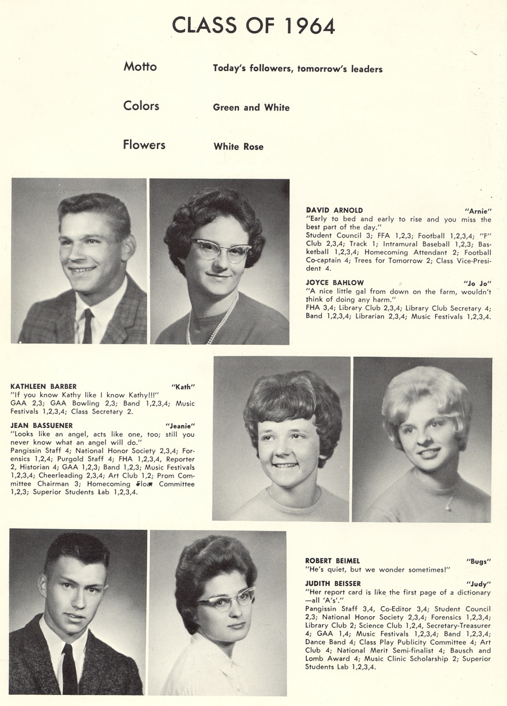 1964 Sheboygan Falls High School, Page 18: David Arnold, Joyce Bahlow, Kathleen Barber, Jean Bassuener, Robert Beimel, Judith Beisser.