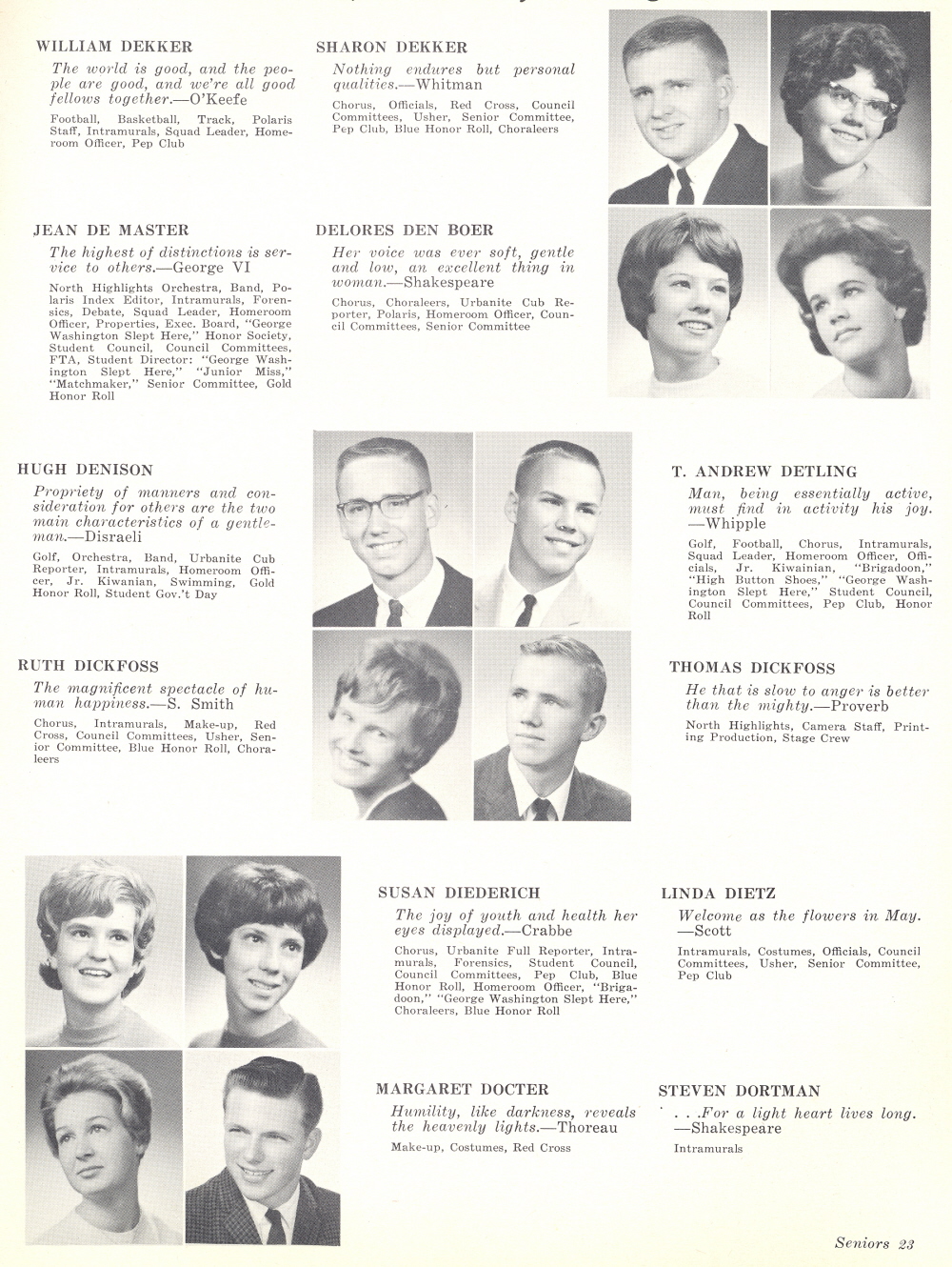 1964 Sheboygan North High School, Page 23: William Dekker, Sharon Dekker, Jean De Master, Delores Den Boer, Hugh Denison, T. Andrew Detling, Ruth Dickfoss, Thomas Dickfoss, Susan Diederich, Linda Dietz, Margaret Docter, Steven Dortman.