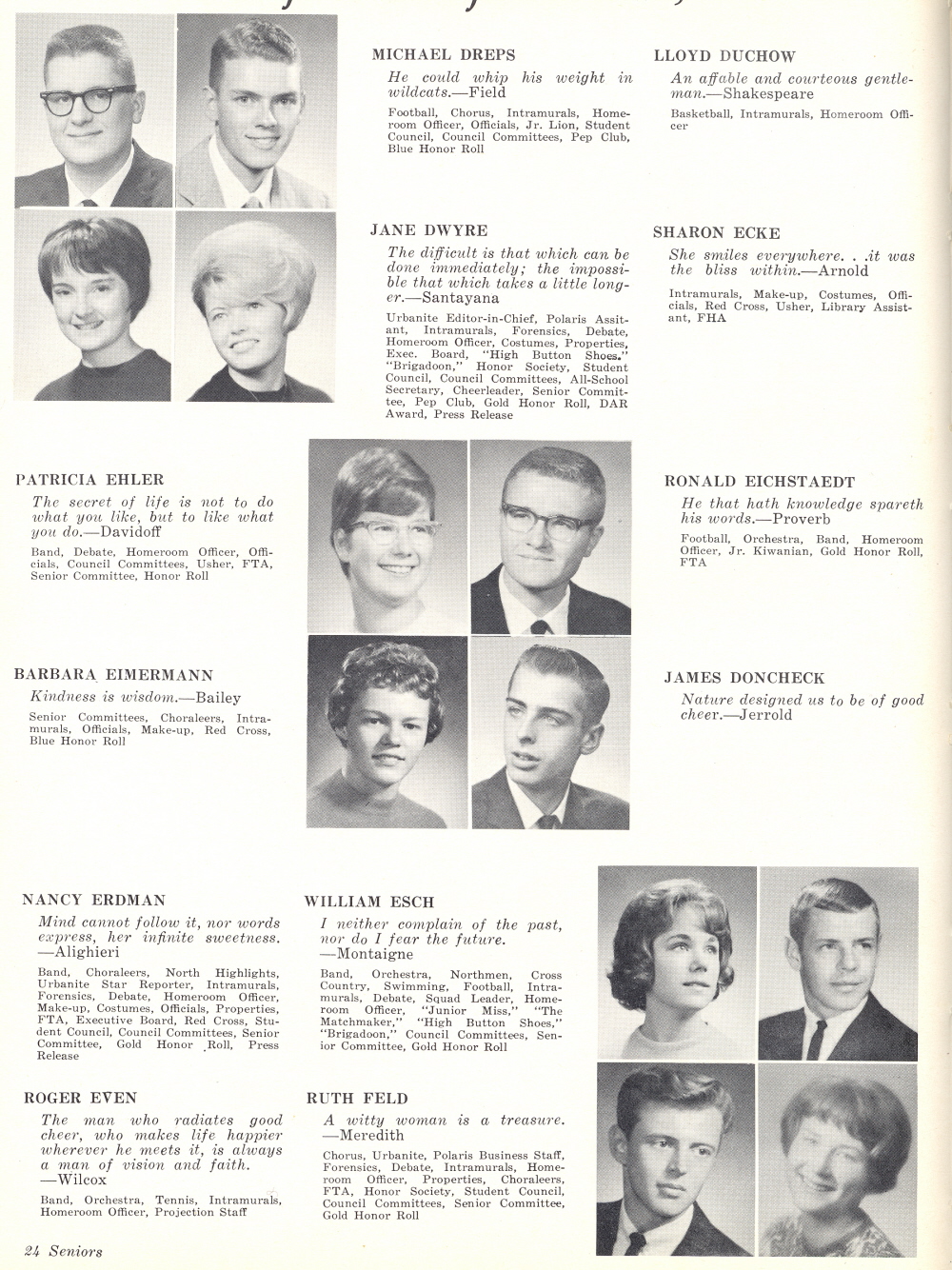 1964 Sheboygan North High School, Page 24: Michael Dreps, Lloyd Duchow, Jane Dwyre, Sharon Ecke, Patricia Ehler, Ronald Eichstaedt, Barbara Eimermann, James Doncheck, Nancy Erdman, William Esch, Roger Even, Ruth Feld.