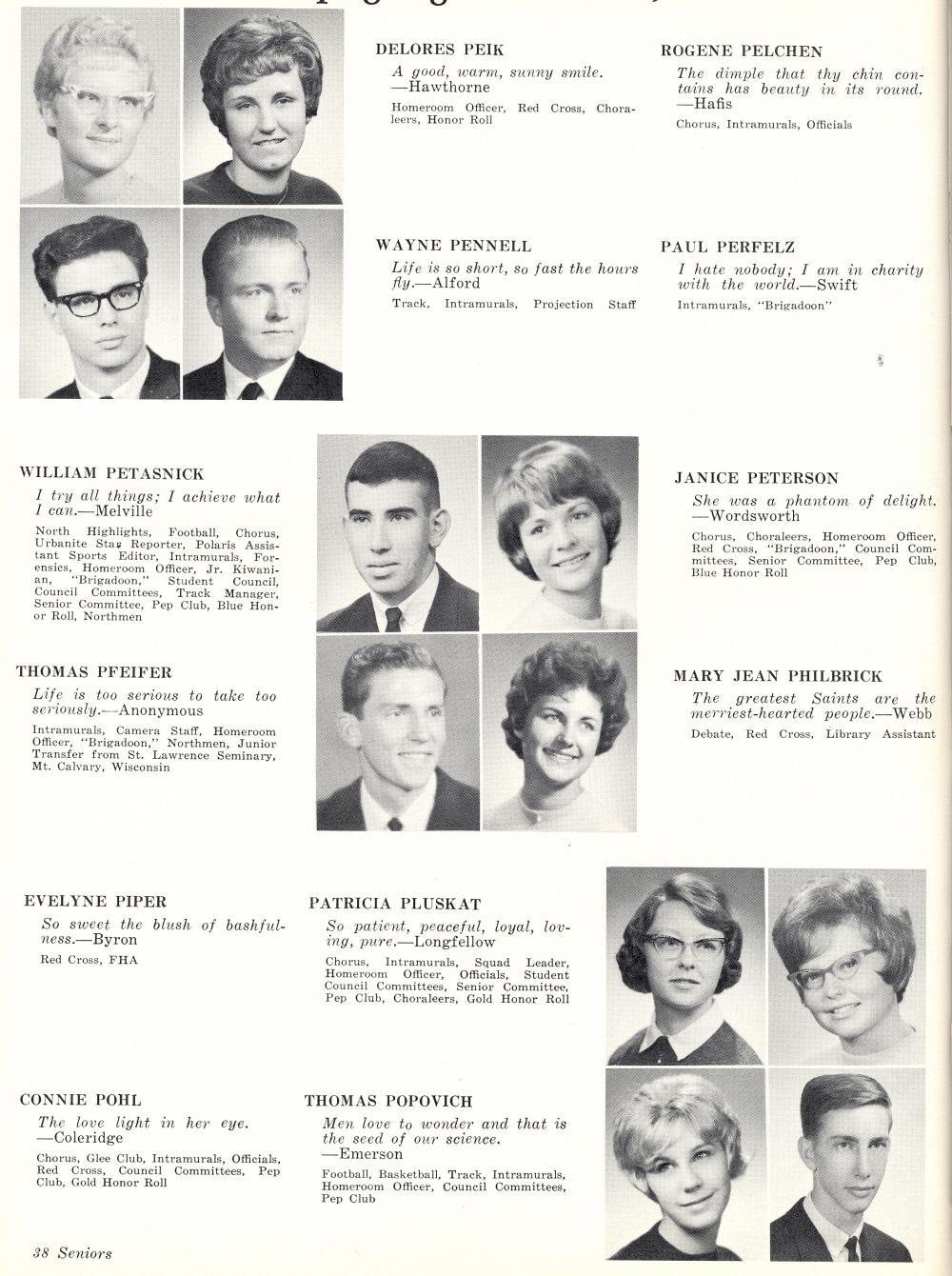 1964 Sheboygan North High School, Page 38: Delores Peik, Rogene Pelchen, Wayne Pennell, Paul Perfelz, William Petasnick, Janice Peterson, Thomas Pfeifer, Mary Jean Philbrick, Evelyne Piper, Patricia Pluskat, Connie Pohl, Thomas Popovich.