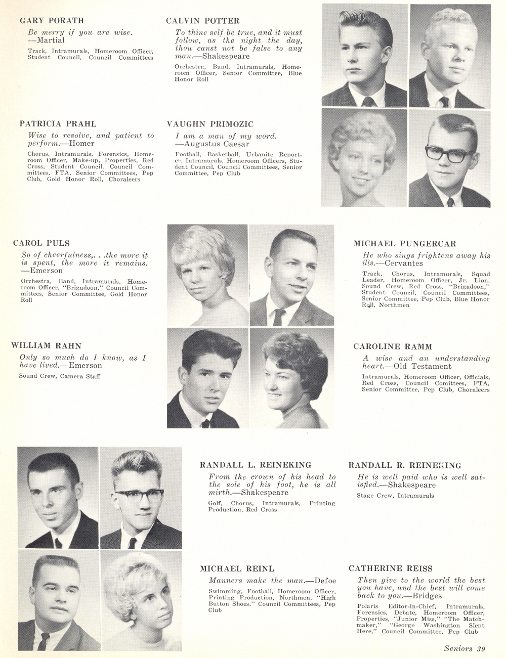 1964 Sheboygan North High School, Page 39: Gary Porath, Calvin Potter, Patricia Prahl, Vaughn Primozic, Carol Puls, Michael Pungercar, William Rahn, Caroline Ramm, Randall Reineking, Michael Reinl, Catherine Reiss.