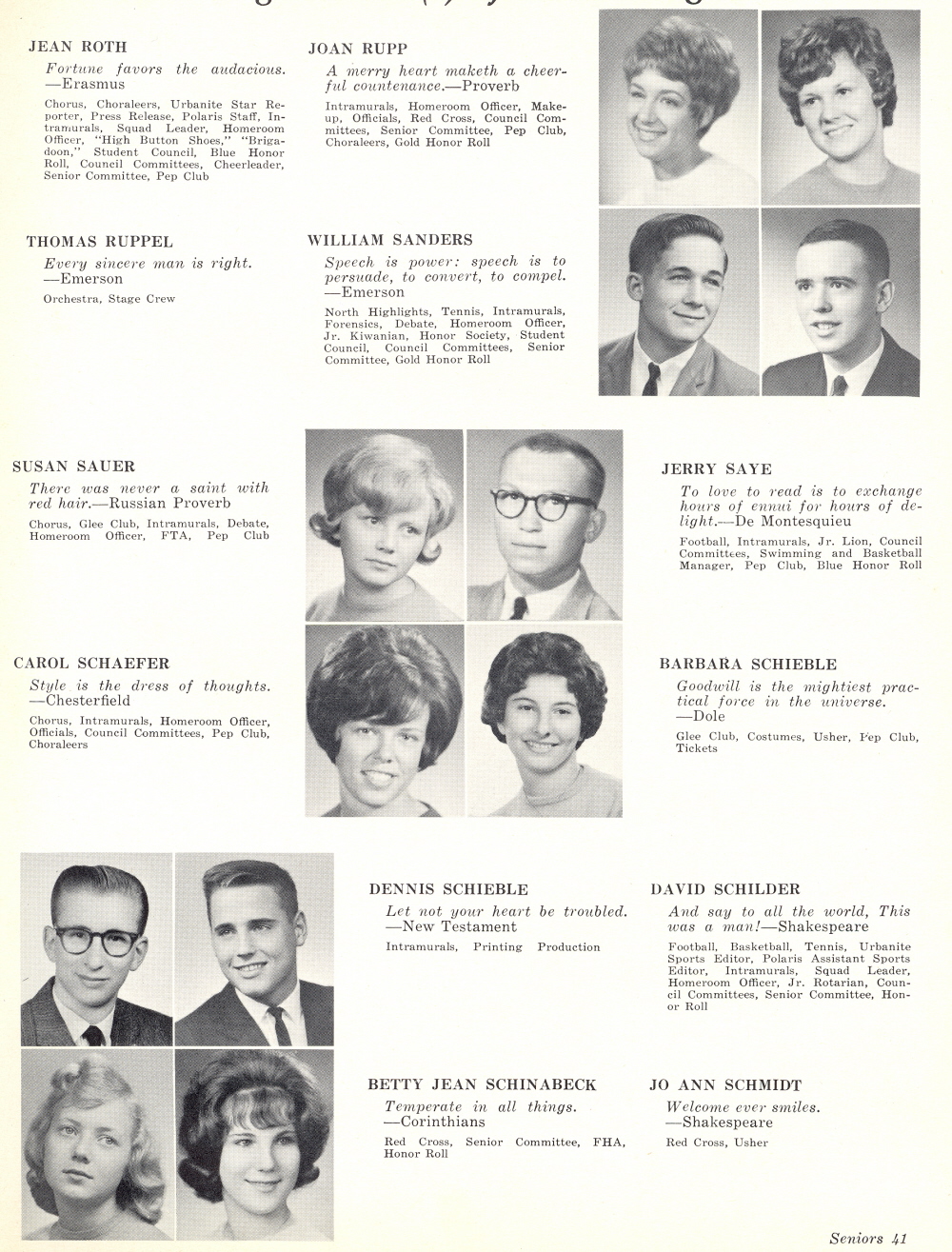 1964 Sheboygan North High School, Page 41: Jean Roth, Joan Rupp, Thomas Ruppel, William Sanders, Susan Sauer, Jerry Saye, Carol Schaefer, Barbara Schieble, Dennis Schieble, David Schilder, Betty Jean Schinabeck, Jo Ann Schmidt.