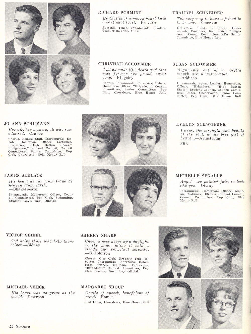 1964 Sheboygan North High School, Page 42: Richard Schmidt, Traudel Schneider, Christine Schommer, Susan Schommer, Jo Ann Schumann, Evelyn Schwoerer, James Sedlack, Michelle Segalle, Victor Seibel, Sherry Sharp, Michael Sheck, Margaret Shoup.