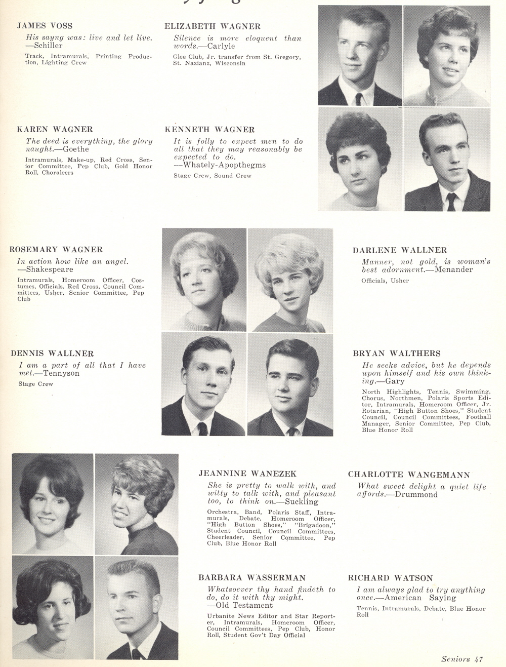 1964 Sheboygan North High School, Page 47: James Voss, Elizabeth Wagner, Karen Wagner, Kenneth Wagner, Rosemary Wagner, Darlene Wallner, Dennis Wallner, Bryan Walthers, Jeannine Wanezek, Charlotte Wangemann, Barbara Wasserman, Richard Watson.