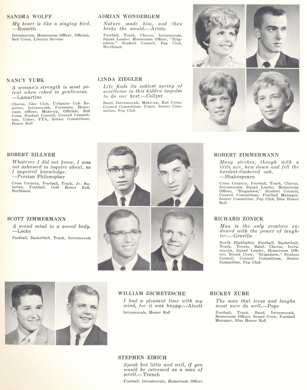 1964 Sheboygan North High School, Page 49: Sandra Wolff, Adrian Wondergem, Nancy Yurk, Linda Ziegler, Robert Zillner, Robert Zimmermann, Scott Zimmermann, Richard Zonick, William Zschetzsche, Rickey Zube, Stephen Eirich.