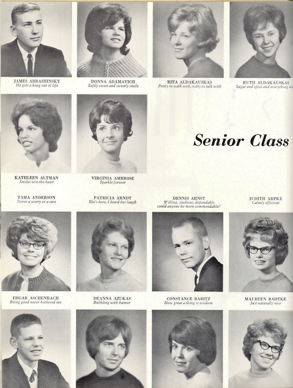 1964 Sheboygan South High School, Page 26. James Abrashinsky, Donna Adamavich, Rita Aldakauskas, Ruth Aldakauskas, Kathleen Altman, Virginia Ambrose, Tama Anderson, Patricia Arndt, Dennis Arnst, Judith Arpke, Edgar Aschenbach, Deanna Azukas, Constance Babitz, Maureen Badtke.