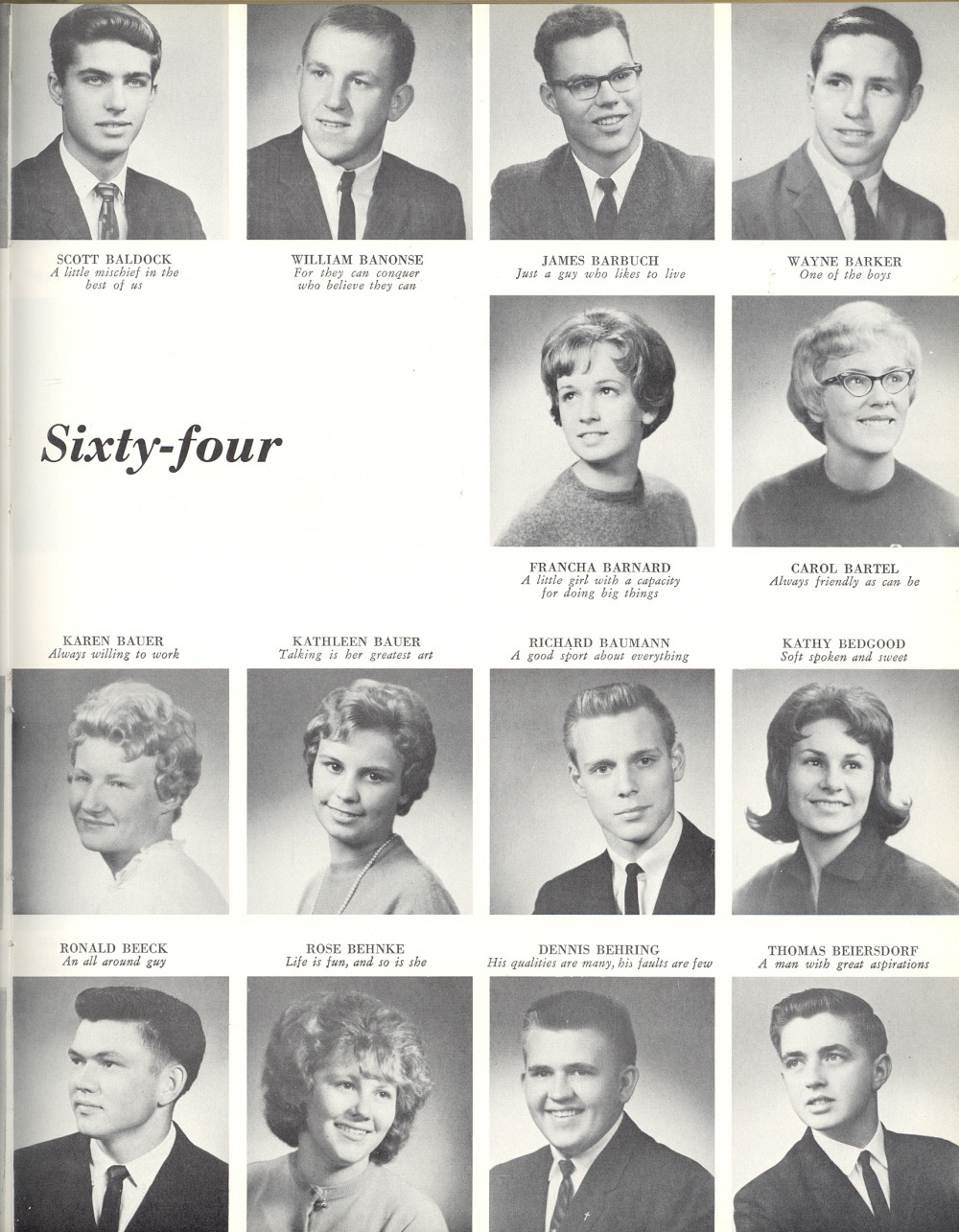 1964 Sheboygan South High School, Page 27. Scott Baldock, William Banonse, James Barbuch, Wayne Barker, Francha Barnard, Carol Bartel, Karen Bauer, Kathleen Bauer, Richard Baumann, Kathy Bedgood, Ronald Beeck, Rose Behnke, Dennis Behring, Thomas Beiersdorf.