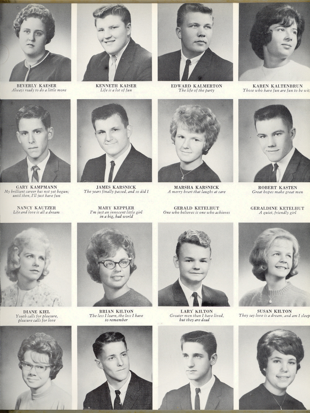 1964 Sheboygan South High School, Page 35. Beverly Kaeser, Kenneth Kaiser, Edward Kalmerton, Karen Kaltenbrun, Gary Kampmann, James Karsnick, Marsha Karsnick, Robert Kasten, Nancy Kautzer, Mary Keppler, Gerald Ketelhut, Geraldine Ketelhut, Diane Kiel, Brian Kilton, Lary Kilton, Susan Kilton.