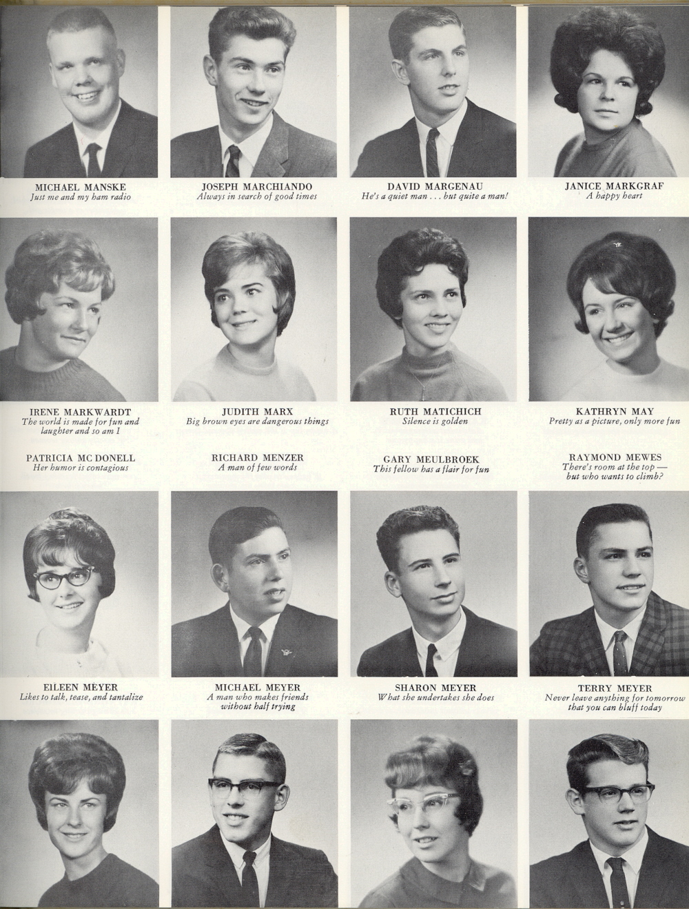1964 Sheboygan South High School, Page 39. Michael Manske, Joseph Marchiando, David Margenau, Janice Markgraf, Irene Markwardt, Judith Mark, Ruth Matichich, Kathryn May, Patricia Mc Donell, Richard Menzer, Gary Meulbroek, Raymond Mewes, Eileen Meyer, Michael Meyer, Sharon Meyer, Terry Meyer.