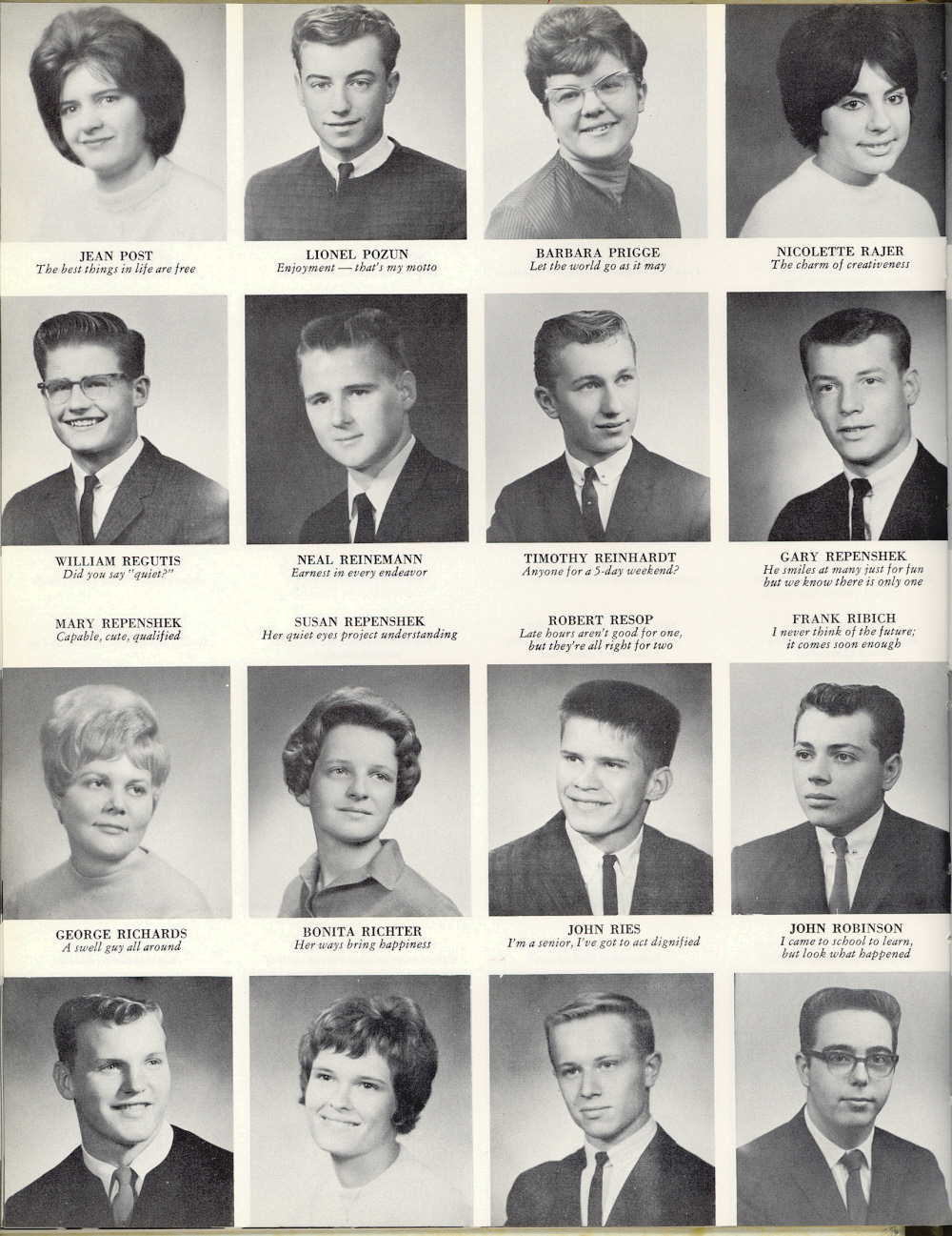 1964 Sheboygan South High School, Page 42. Jean Post, Lionel Pozun, Barbara Prigge, Nicolette Rajer, William Regutis, Neal Reinemann, Timothy Reinhardt, Gary Repenshek, Mary Repenshek, Susan Repenshek, Robert Resop, Frank Ribich, George Richards, Bonita Richter, John Ries, John Robertson.