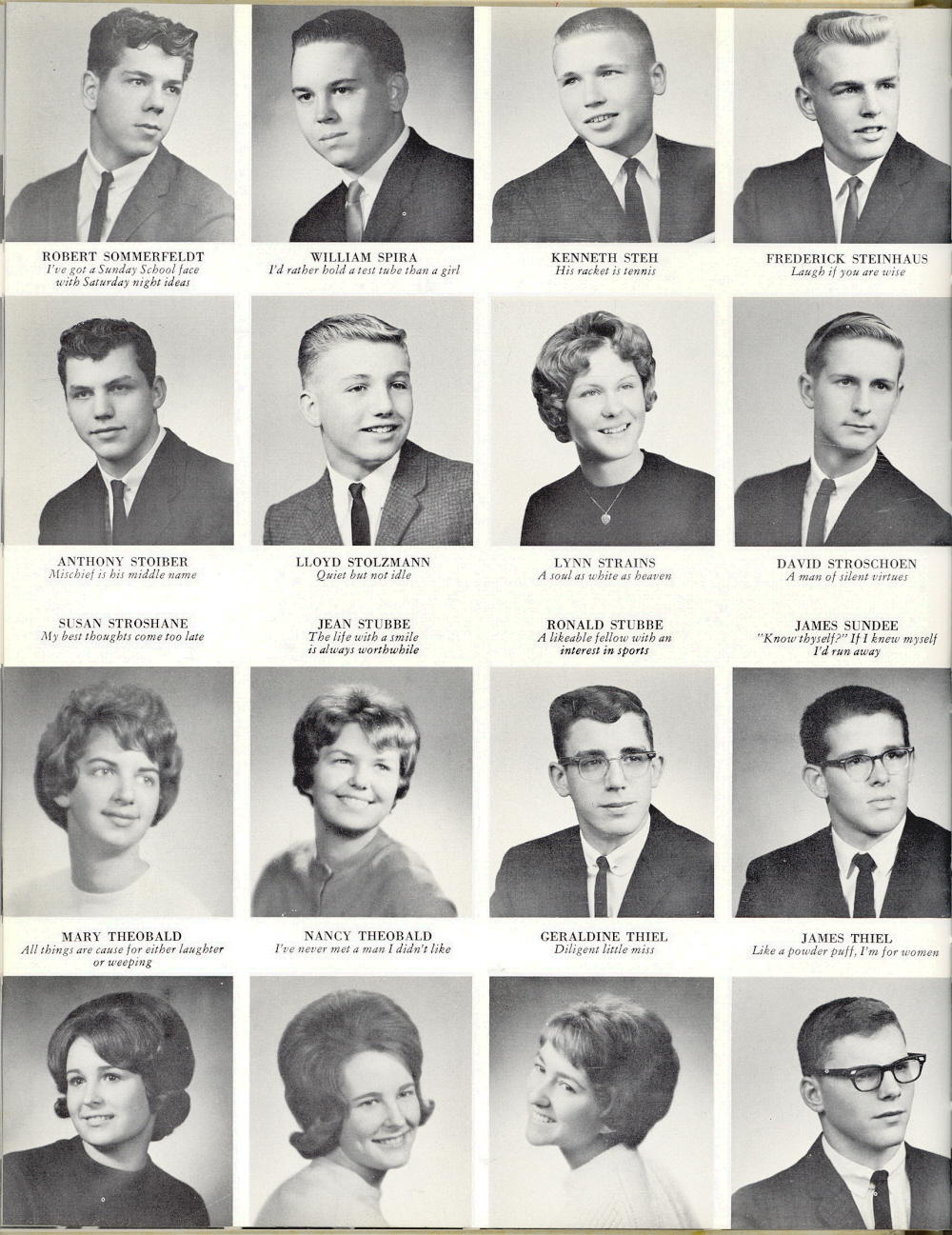 1964 Sheboygan South High School, Page 46. Robert Sommerfeldt, William Spira, Kenneth Steh, Frederick Steinhaus, Anthony Stoiber, Lloyd Stolzmann, Lynn Strains, David Stroschoen, Susan Stroshane, Jean Stubbe, Ronald Stubbe, James Sundee, Mary Theobald, Nancy Theobald, Geraldine Thiel, James Thiel.