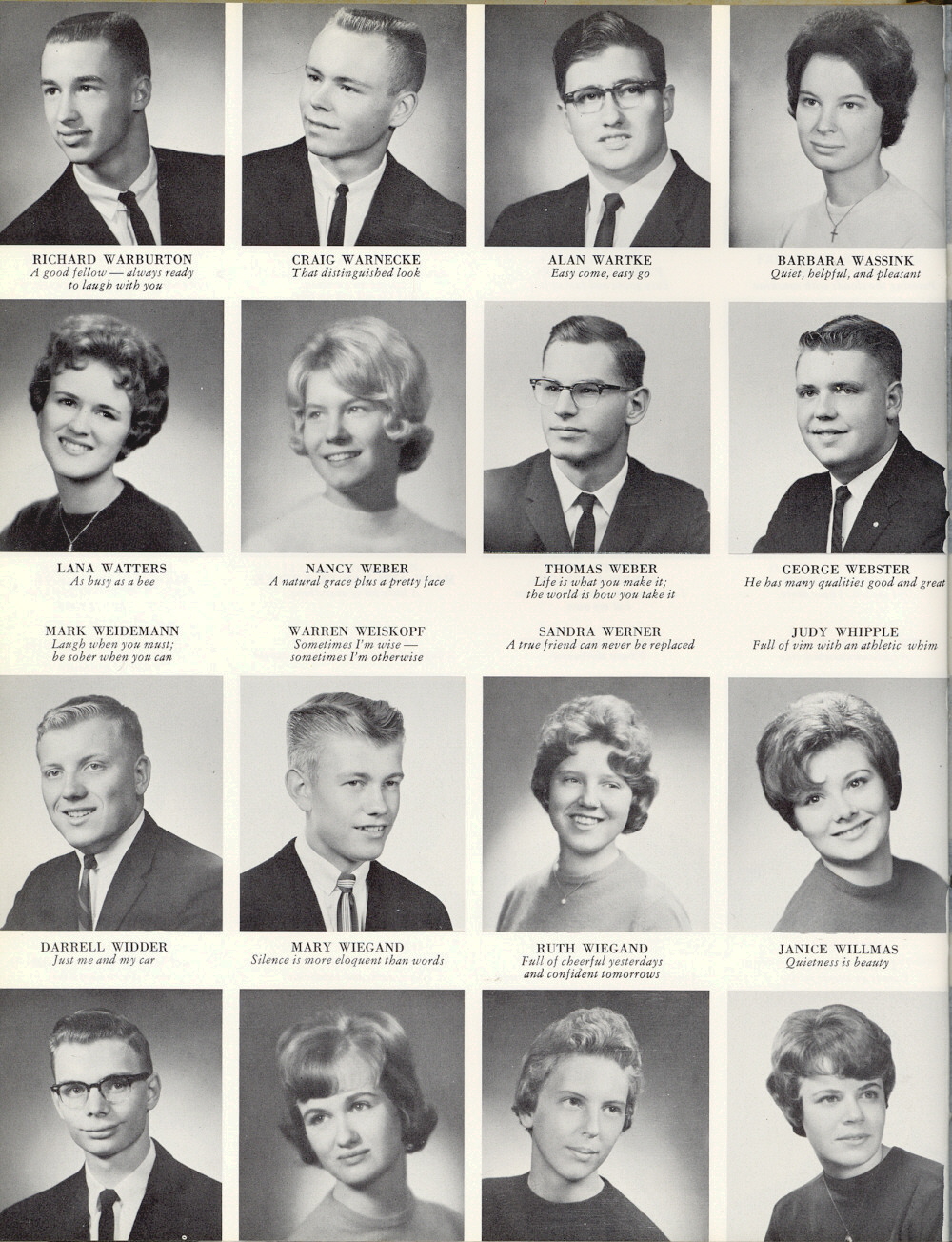 1964 Sheboygan South High School, Page 48. Richard Warburton, Craig Warnecke, Alan Wartke, Barbara Wassink, Lana Watters, Nancy Weber, Thomas Weber, George Webster, Mark Weidemann, Warren Weiskopf, Sandra Werner, Judy Whipple, Darrell Widder, Mary Wiegand, Ruth Wiegand, Janice Willmas.