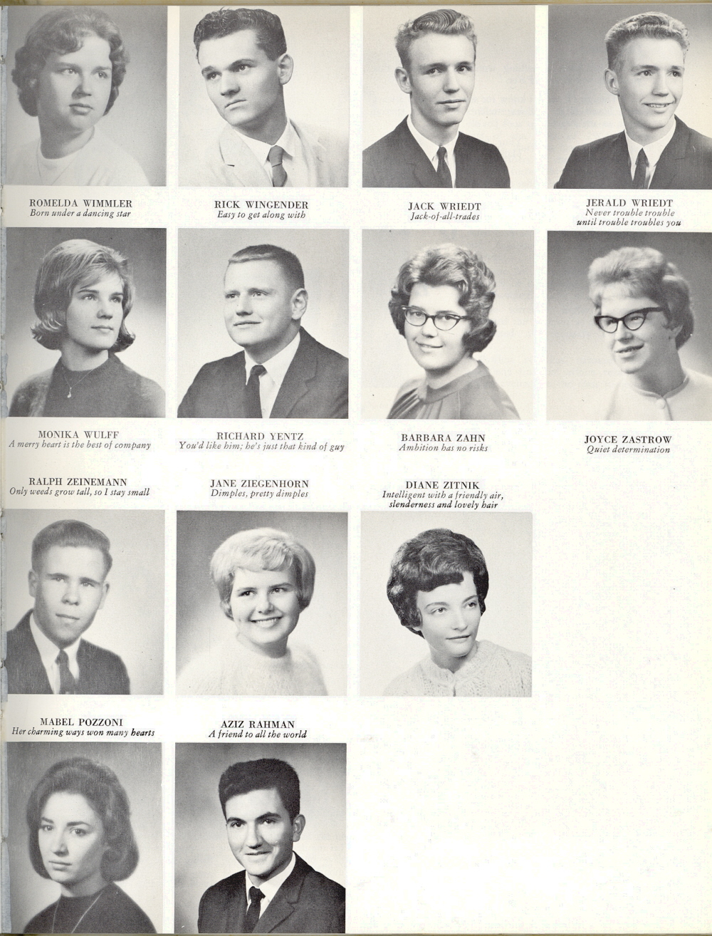 1964 Sheboygan South High School, Page 49. Romelda Wimmler, Rick Wingender, Jack Wriedt, Jerald Wriedt, Monika Wulff, Richard Yentz, Barbara Zahn, Joyce Zastrow, Ralph Zeinemann, Jane Ziegenhorn, Diane Zitnik, Mabel Pozzoni, Aziz Rahman.