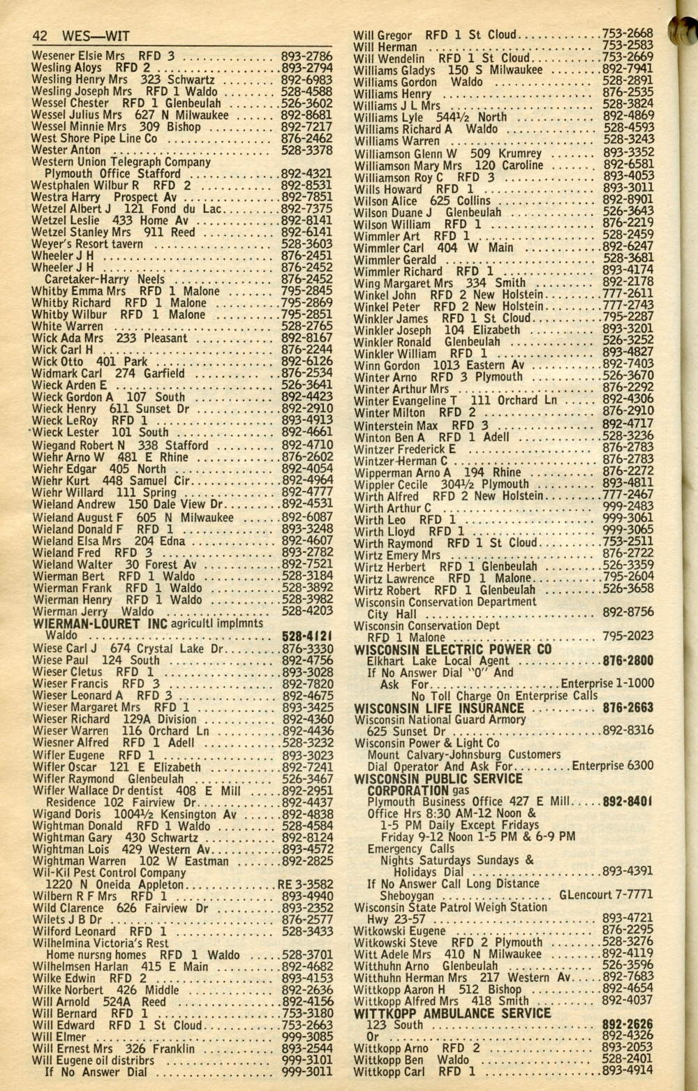 1965 General Telephone Company Telephone Book Page 42: Wesener - Wittkopp.