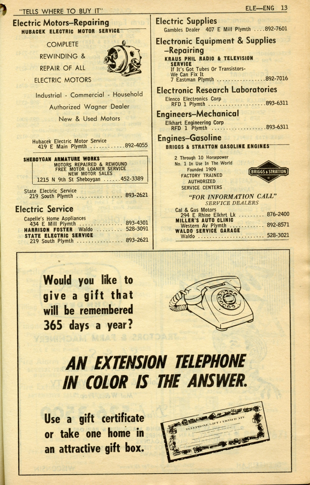 1965 General Telephone Company Telephone Book Page 57: Electric - Engines.