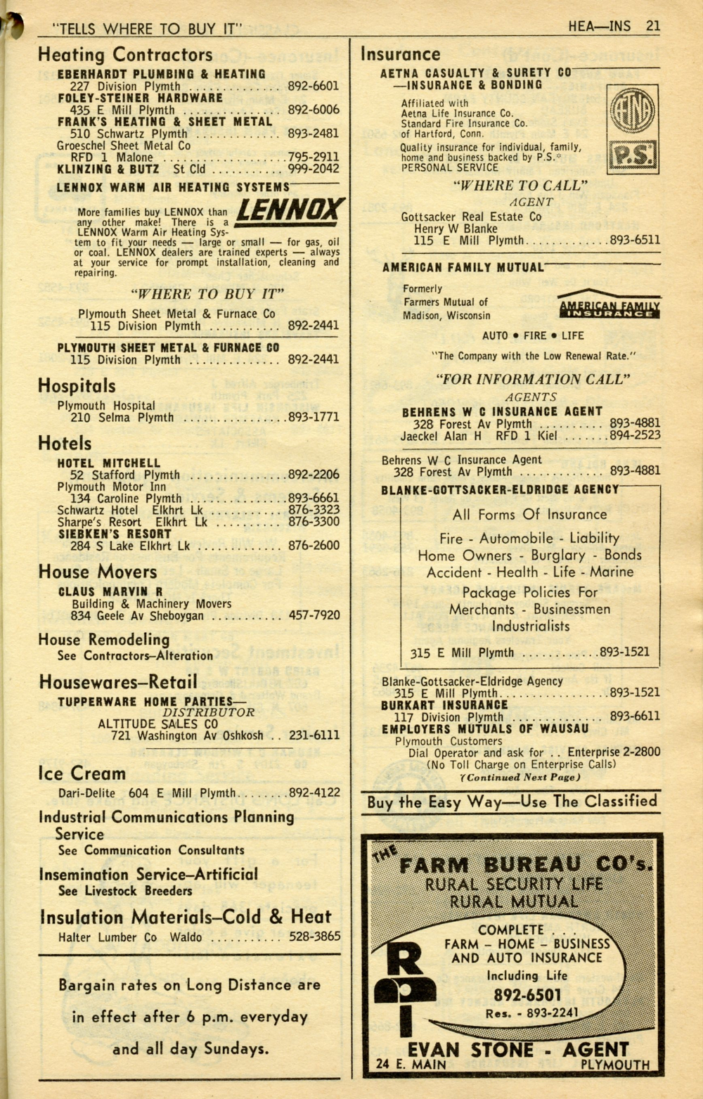 1965 General Telephone Company Telephone Book Page 65: Heating Contractors - Insurance.