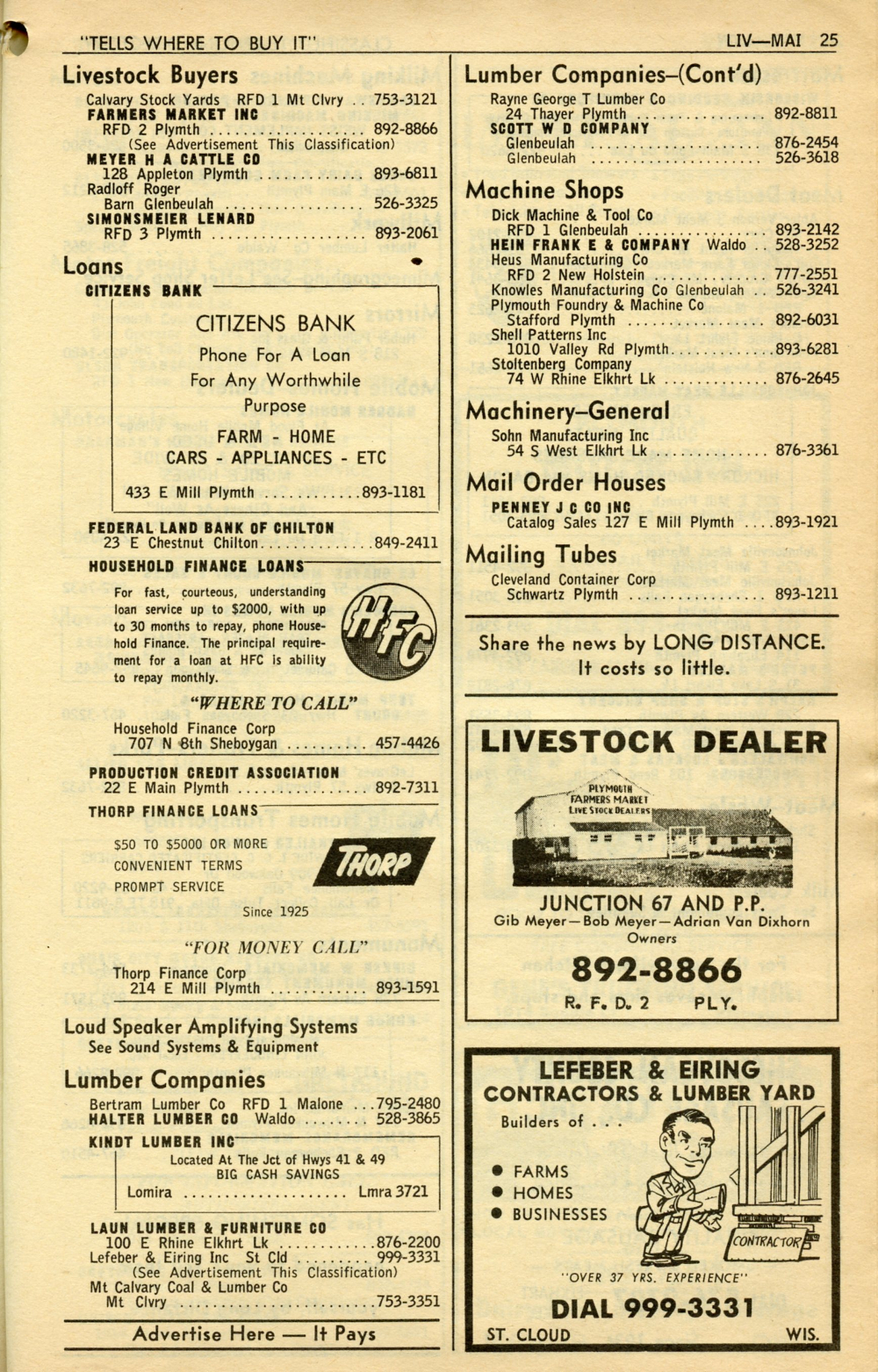 1965 General Telephone Company Telephone Book Page 69: Livestock Buyers - Mailing Tubes.