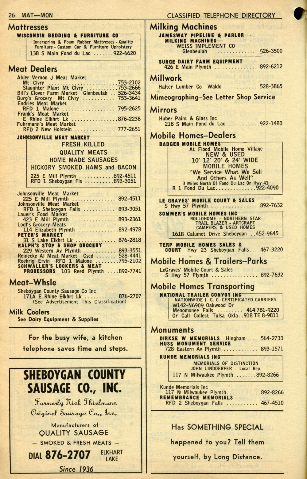 1965 General Telephone Company Telephone Book Page 70: Mattresses - Monuments.
