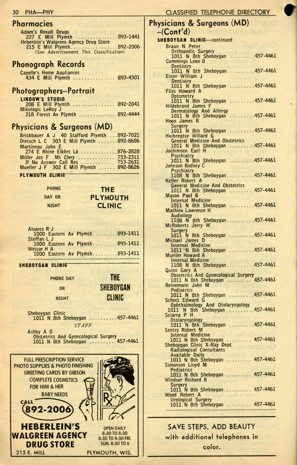 1965 General Telephone Company Telephone Book Page 74: Pharmacies - Physicians and Surgeons.