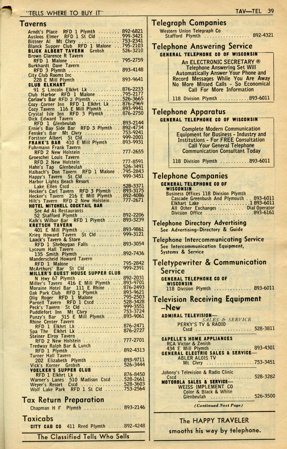 1965 General Telephone Company Telephone Book Page 83: Taverns - Television Receiving Equipment.