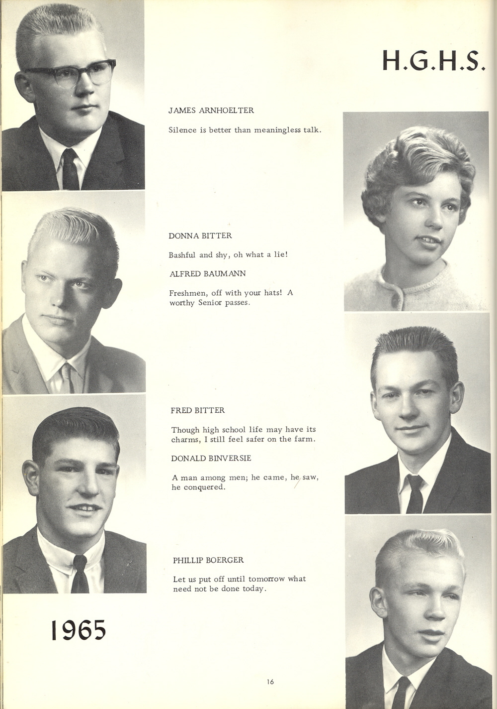 1965 Howards Grove High School, Page 16: James Arnhoelter, Donna Bitter, Alfred Baumann, Fred Bitter, Donald Binversie, Phillip Boerger.