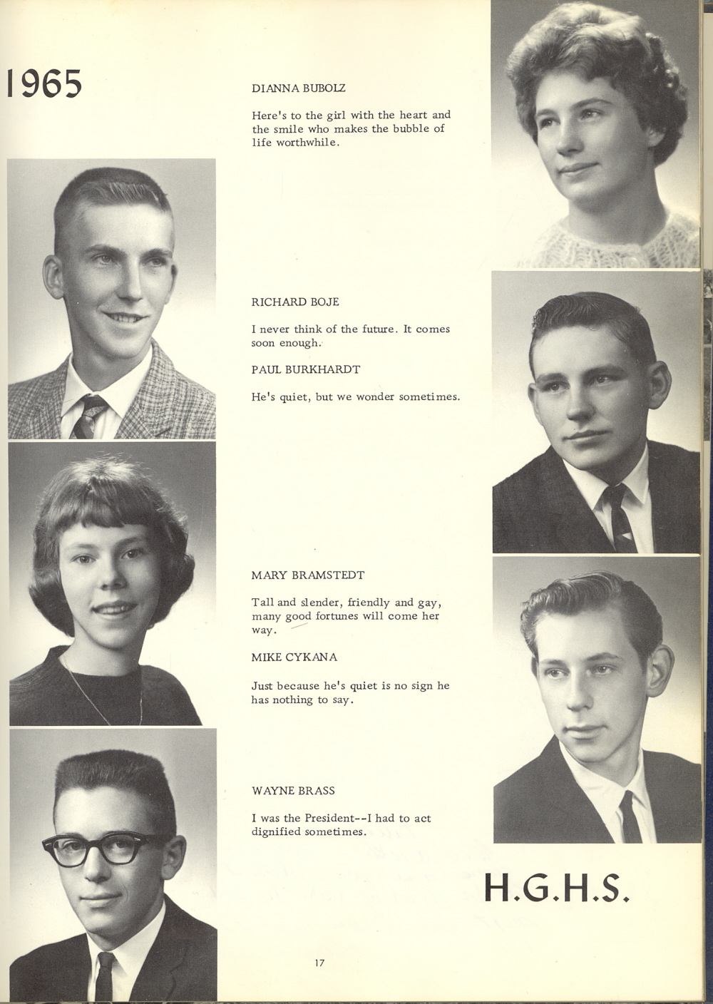1965 Howards Grove High School, Page 17: Dianna Bubolz, Richard Boje, Paul Burkhardt, Mary Bramstedt, Mike Cykana, Wayne Brass.