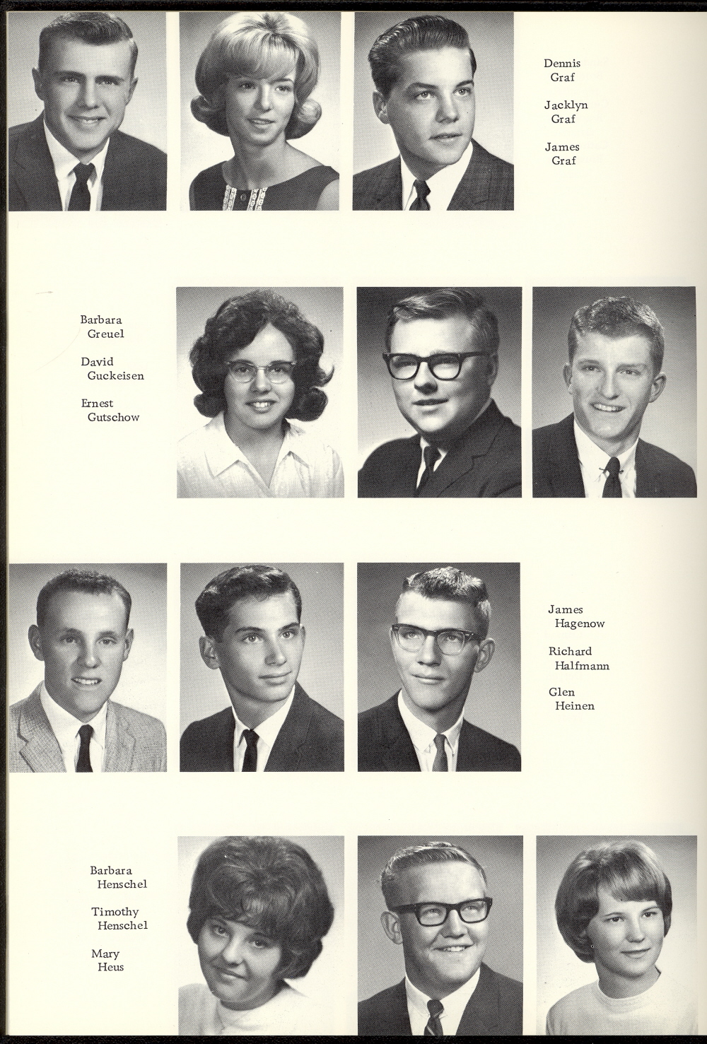 1965 Kiel High School, Page 68: Dennis Graf, Jacklyn Graf, James Graf, Brabara Breuel, David Guckeisen, Ernest Gutschow, James Hagenow, Richard Halfmann, Glen Heinen, Barbara Henschel, Timothy Henschel, Mary Heus.