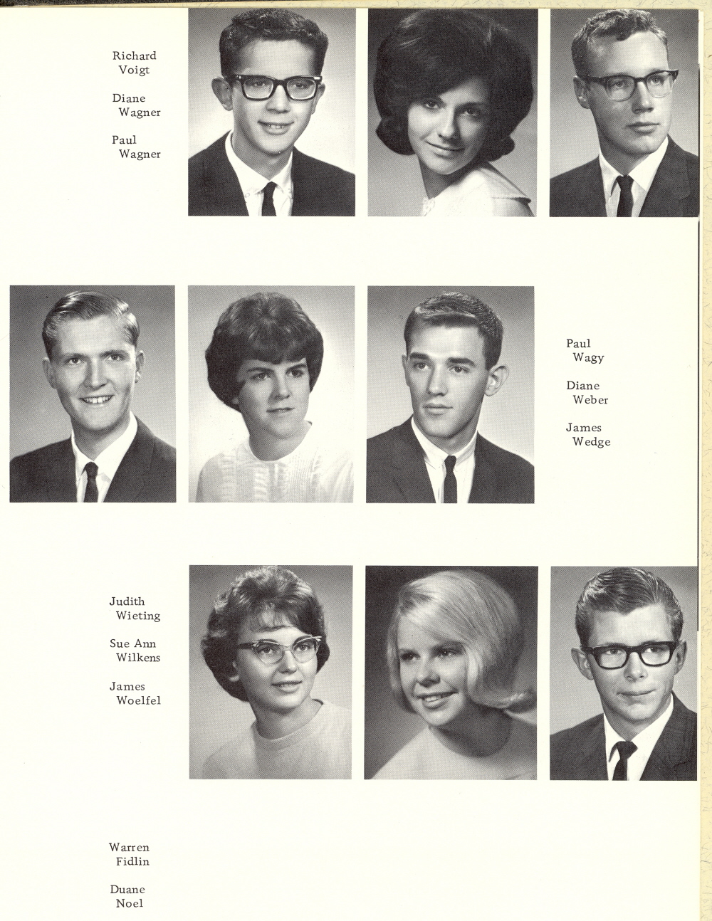 1965 Kiel High School, Page 75: Richard Voigt, Diane Wagner, Paul Wagner, Paul Wagy, Diane Weber, James Wedge, Judith Wieting, Sue Ann Wilkens, James Woelfel, Warren Fidlin, Duane Noel.