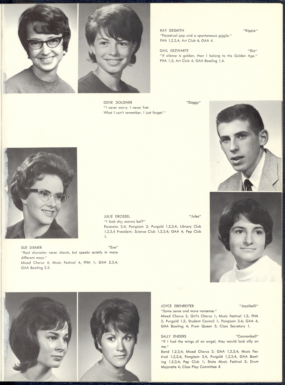 1965 Sheboygan Falls High School, Page 17: Kay Desmith, Gail Dezwarte, Gene Dolgner, Julie Drossel, Sue Diemer, Joyce Ebenreiter, Sally Enders.