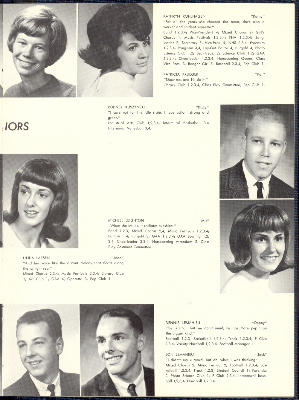 1965 Sheboygan Falls High School, Page 21: Kathryn Kohlhagen, Patricia Krueger, Rodney Kuszynski, Michele Leighton, Linda Larsen, Dennis Lemahieu, Jon Lemahieu.