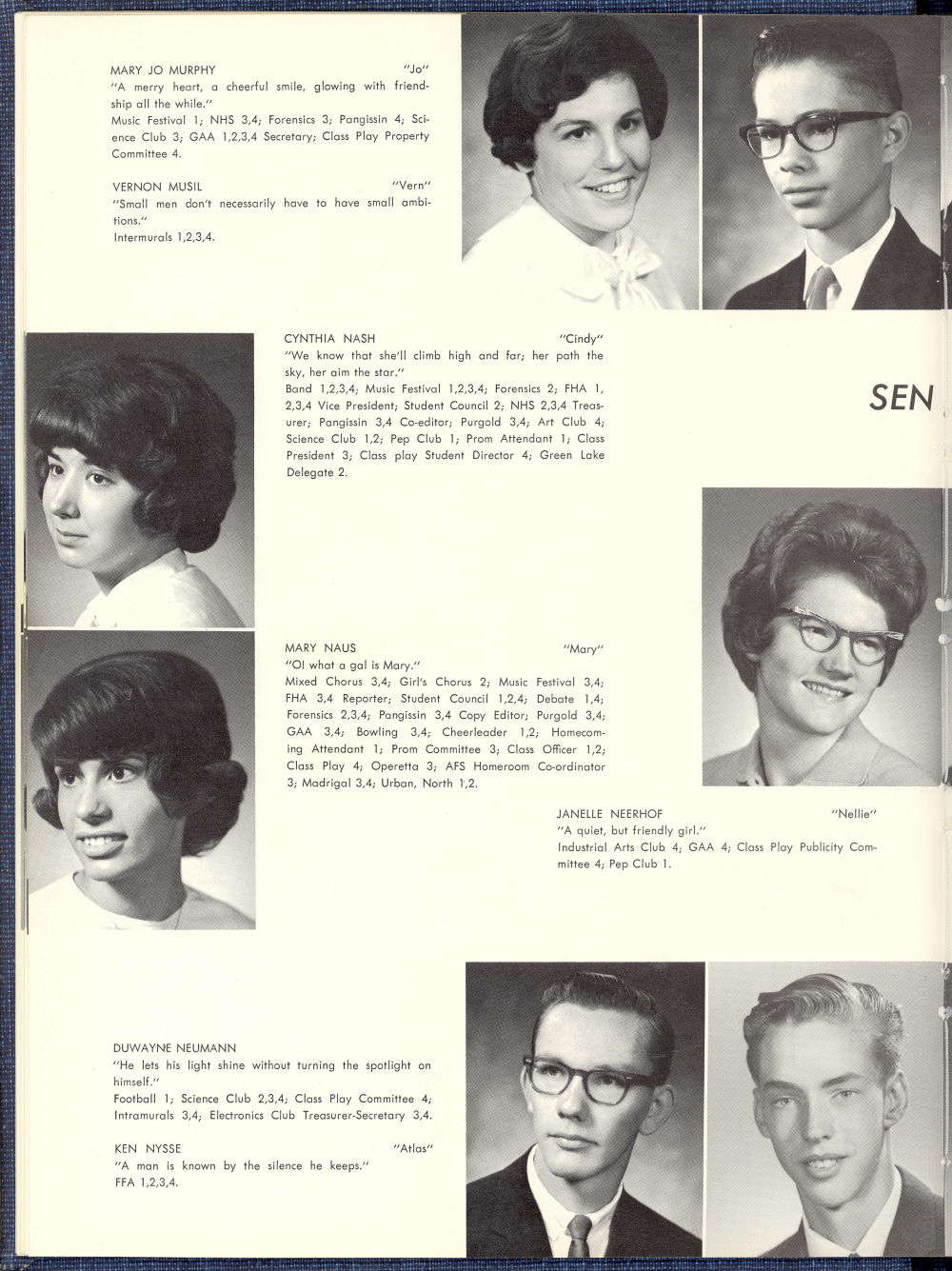 1965 Sheboygan Falls High School, Page 24: Mary Murphy, Vernon Musil, Cynthia Nash, Mary Naus, Janelle Neerhof, Duwayne Neumann, Ken Nysse.