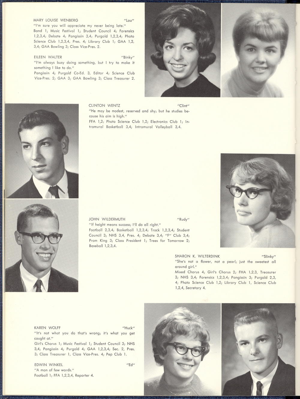 1965 Sheboygan Falls High School, Page 30: Mary Wenberg, Eileen Walter, Clinton Wentz, John Wildermuth, Sharon Wilterdink, Karen Wolff, Edwin Winkel.