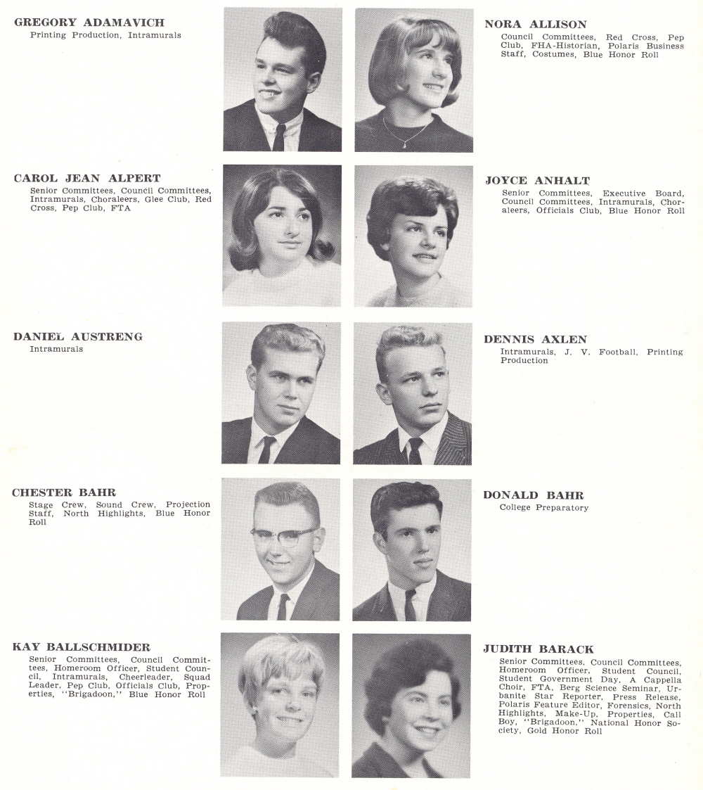 1965 Sheboygan North High School, Page 20: Gregory Adamavich, Nora Allison, Carol Alpert, Joyce Anhalt, Daniel Austreng, Dennis Axlen, Chester Bahr, Donald Bahr, Kay Ballschmider, Judith Barack.