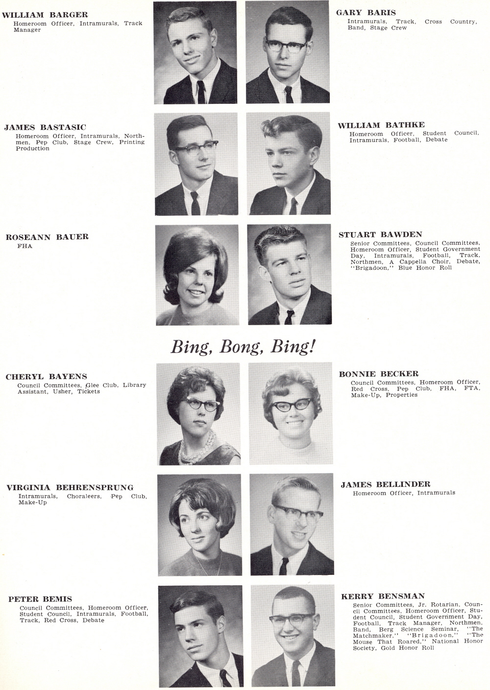 1965 Sheboygan North High School, Page 21: William Barger, Gary Baris, James Bastasic, William Bathke, Roseann Bauer, Stuart Bawden, Cheryl Bayens, Bonnie Becker, Virginia Behrensprung, James Bellinder, Peter Bemis, Kerry Bensman.