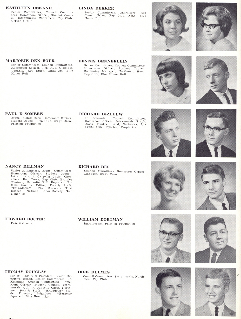 1965 Sheboygan North High School, Page 26: Kathleen Dekanic, Linda Dekker, Marjorie Den Boer, Dennis Dennerlein, Paul DeSombre, Richard DeZeeuw, Nancy Dillman, Richard Dix, Edward Doctor, William Dortman, Thomas Douglas, Dirk Dulmes.