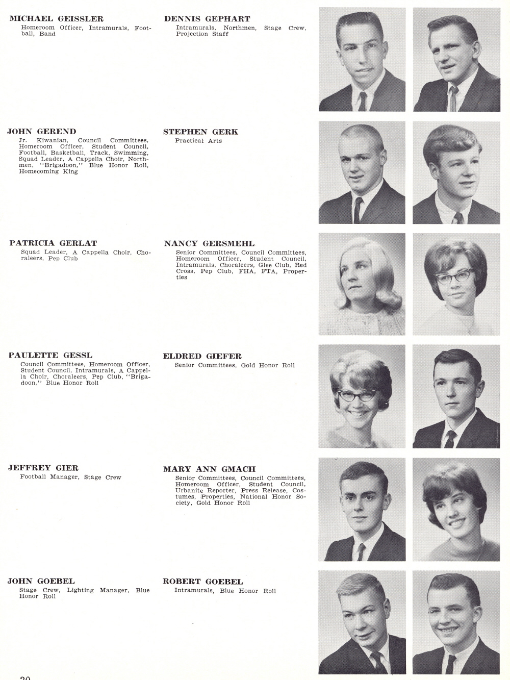 1965 Sheboygan North High School, Page 30: Michael Geissler, Dennis Gephart, John Gerend, Stephen Gerk, Patricia Gerlat,, Nancy Gersmehl, Paulette Gessl, Eldred Giefer, Jeffrey Gier, Mary Ann Gmach, John Goebel, Robert Goebel.