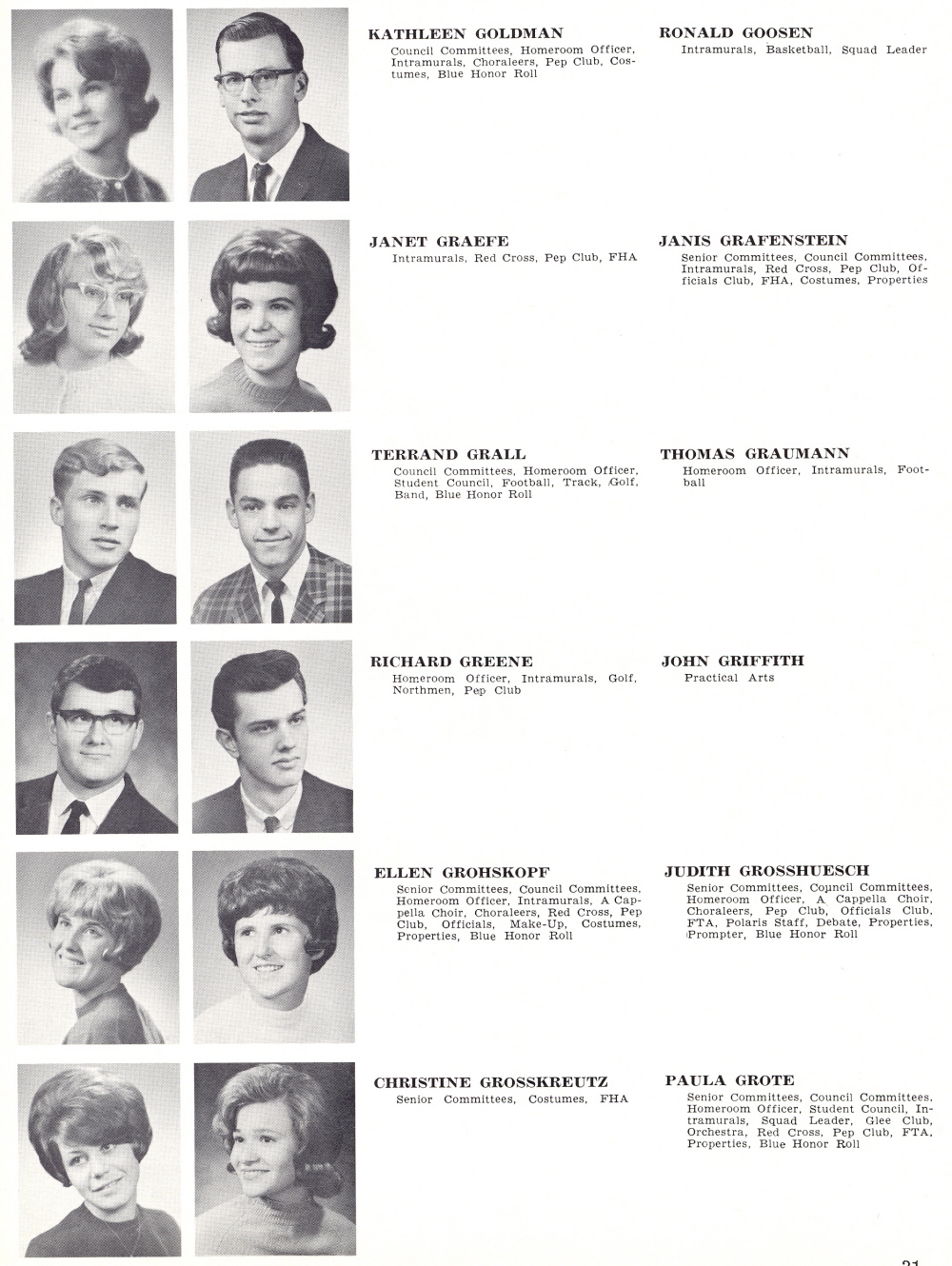 1965 Sheboygan North High School, Page 31: Kathleen Goldman, Ronald Goosen, Janet Graefe, Janis Grafenstein, Terrand Grall, Thomas Graumann, Richard Greene, John Griffith, Ellen Grohskopf, Judith Grosshuesch, Christine Grosskreutz, Paula Grote.