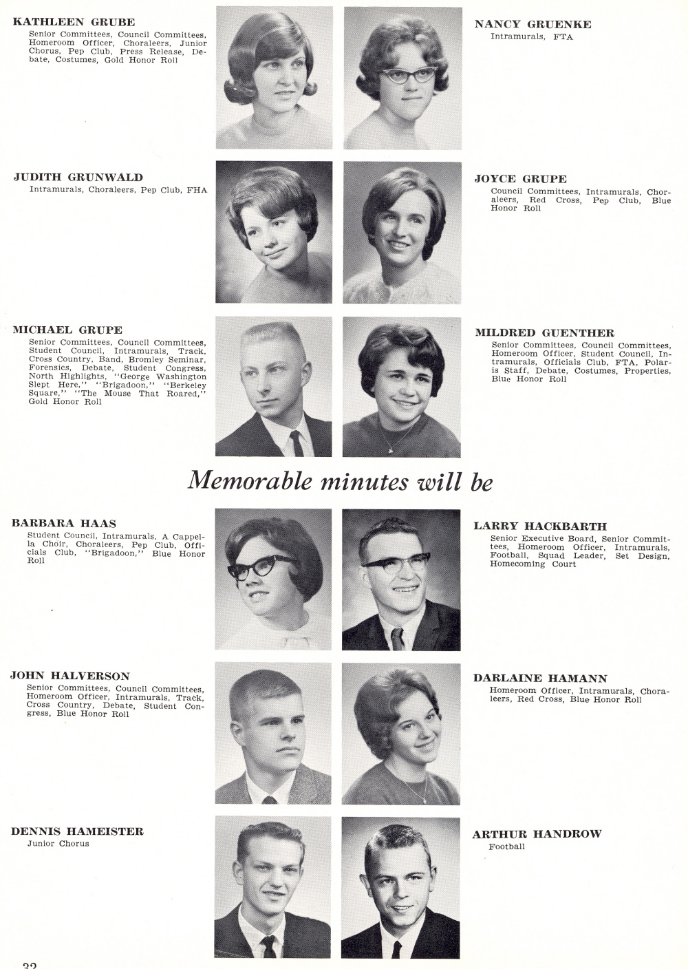 1965 Sheboygan North High School, Page 32: Kathleen Grube, Nancy Gruenke, Judith Grunwald, Joyce Grupe, Michael Grupe, Mildred Guenther, Barbara Haas, Larry Hackbarth, John Halverson, Darlaine Hamann, Dennis Hameister, Arthur Handrow.