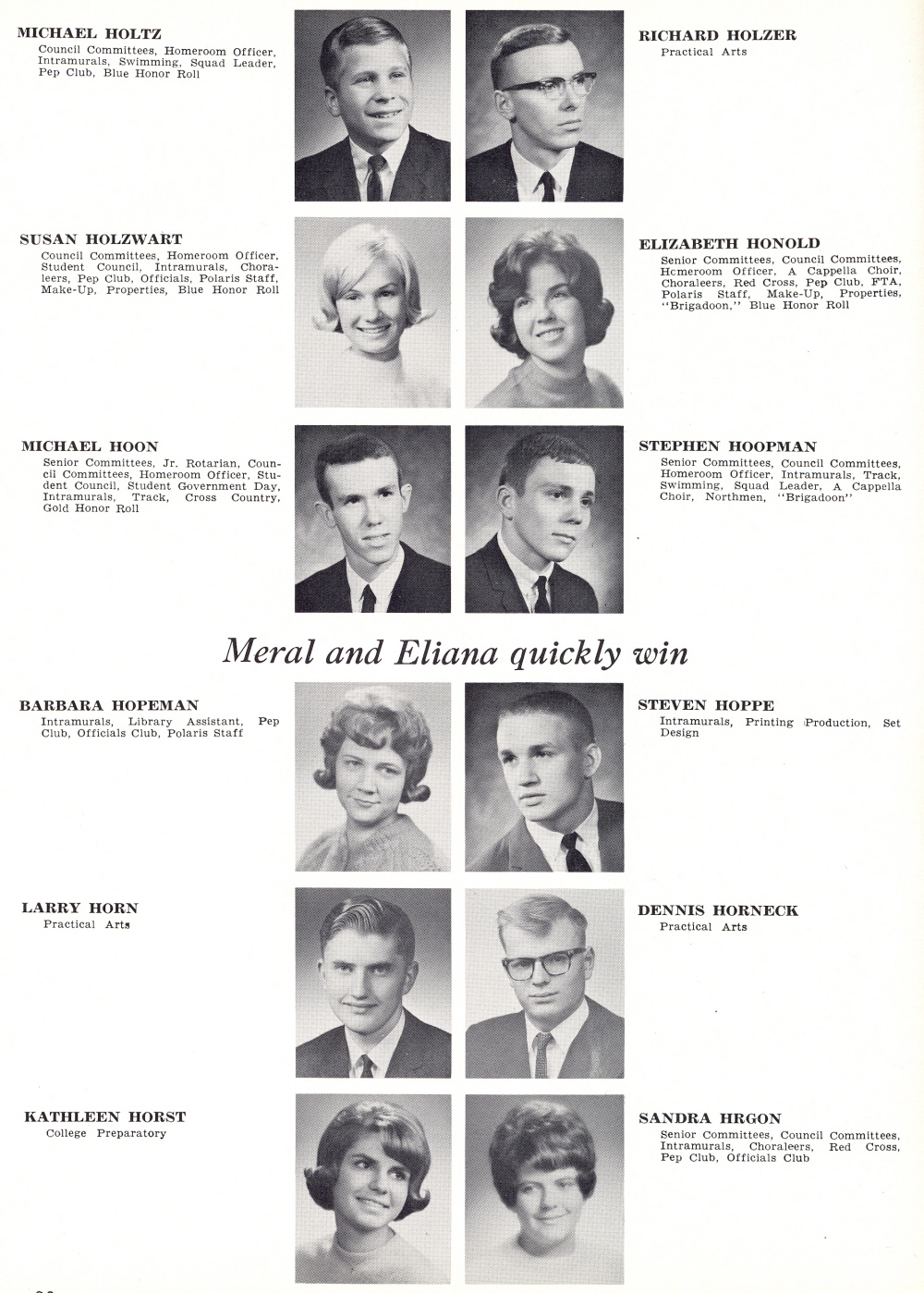 1965 Sheboygan North High School, Page 36: Michael Holtz, Richard Holzer, Susan Holzwart, Elizabeth Honold, Michael Hoon, Stephen Hoopman, Barbara Hopeman, Steven Hoppe, Larry Horn, Dennis Horneck, Kathleen Horst, Sandra Hrgon.