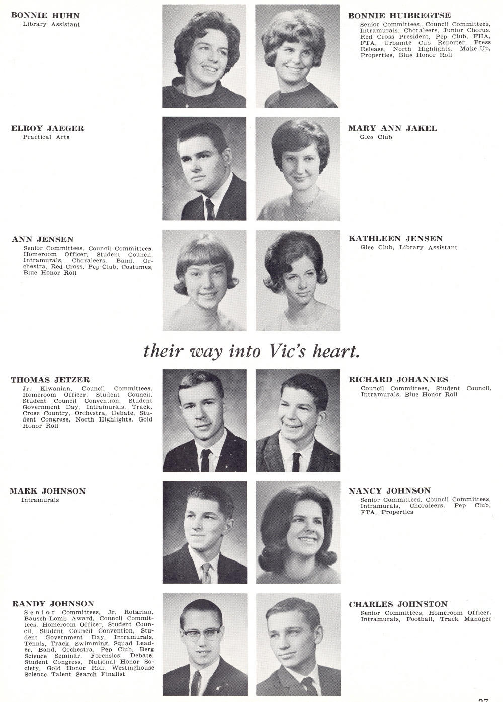 1965 Sheboygan North High School, Page 37: Bonnie Huhn, Bonnie Huibregtse, Elroy Jaeger, Mary Ann Jakel, Ann Jensen, Kathleen Jensen, Thomas Jetzer, Richard Johannes, Mark Johnson, Nancy Johnson, Randy Johnson, Charles Johnson.