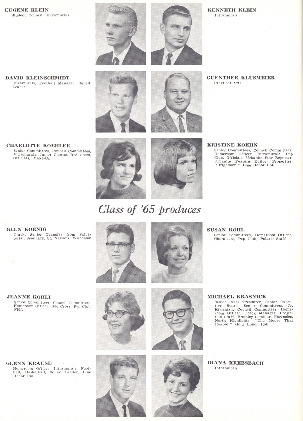1965 Sheboygan North High School, Page 40: Eugene Klein, Kenneth Klein, David Kleinschmidt, Guenther Klusmeier, Charlotte Koehler, Kristine Koehn, Glen Koenig, Susan Kohl, Jeanne Kohli, Michael Krasnick, Glenn Krause, Diana Krebsbach.