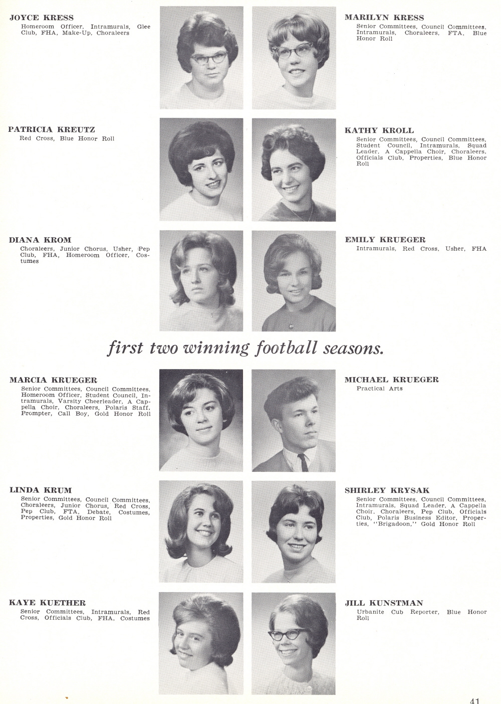 1965 Sheboygan North High School, Page 41: Joyce Kress, Marilyn Kress, Patricia Kreutz, Kathy Kroll, Diana Krom, Emily Krueger, Marcia Krueger, Michael Krueger, Linda Krum, Shirley Krysak, Kaye Kuether, Jill Kunstman.