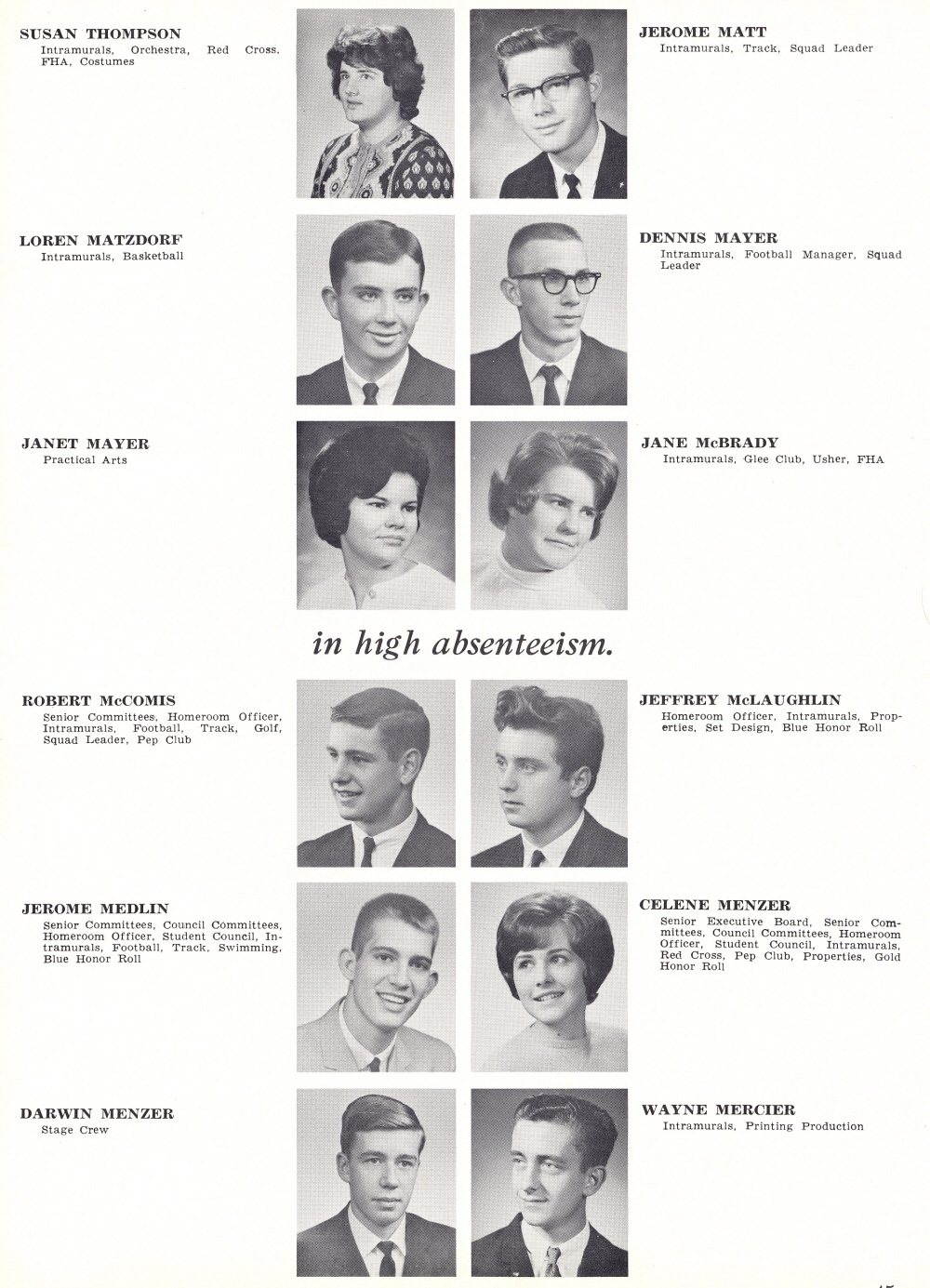 1965 Sheboygan North High School, Page 45: Susan Thompson, Jerome Matt, Loren Matzdorf, Dennis Mayer, Janet Mayer, Jane McBrady, Robert McComis, Jeffrey McLaughlin, Jerome Medlin, Celene Menzer, Darwin Menzer, Wayne Mercier.
