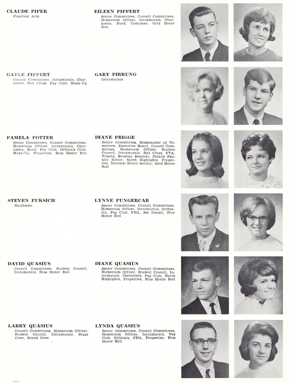 1965 Sheboygan North High School, Page 50: Claude Piper, Elieen Pippert, Gayle Pippert, Gary Pirrung, Pamela Potter, Diane Prigge, Steven Puksich, Lynne Pungercar, David Quasius, Diane Quasius, Larry Quasius, Lynda Quasius.