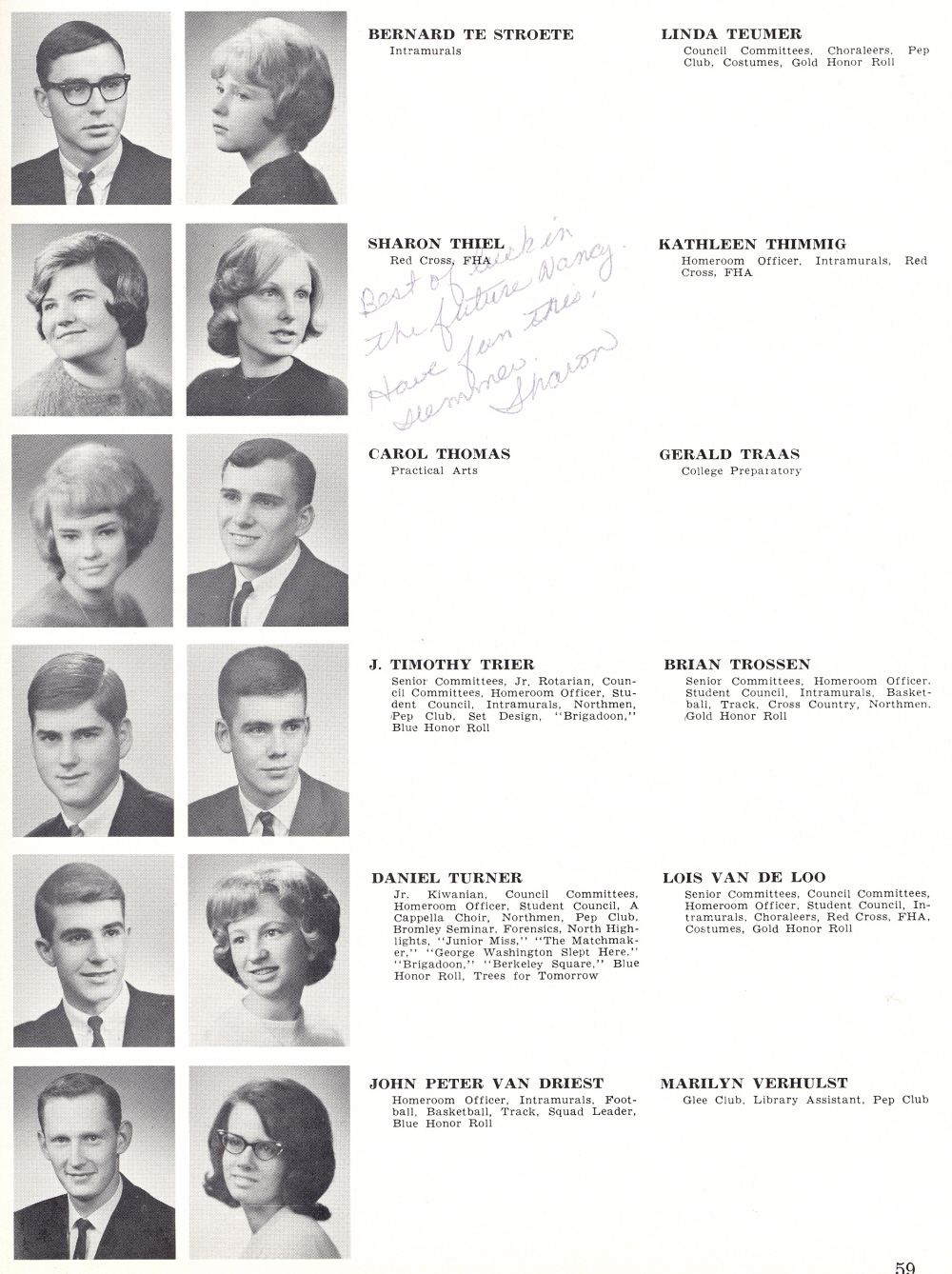 1965 Sheboygan North High School, Page 59: Bernard Te Stroete, Linda Teumer, Sharon Thiel, Kathleen Thimmig, Carol Thomas, Gerald Traas, J. Timothy Trier, Brian Trossen, Daniel Turner, Lois Van De Loo, John Van Driest, Marilyn Verhulst.