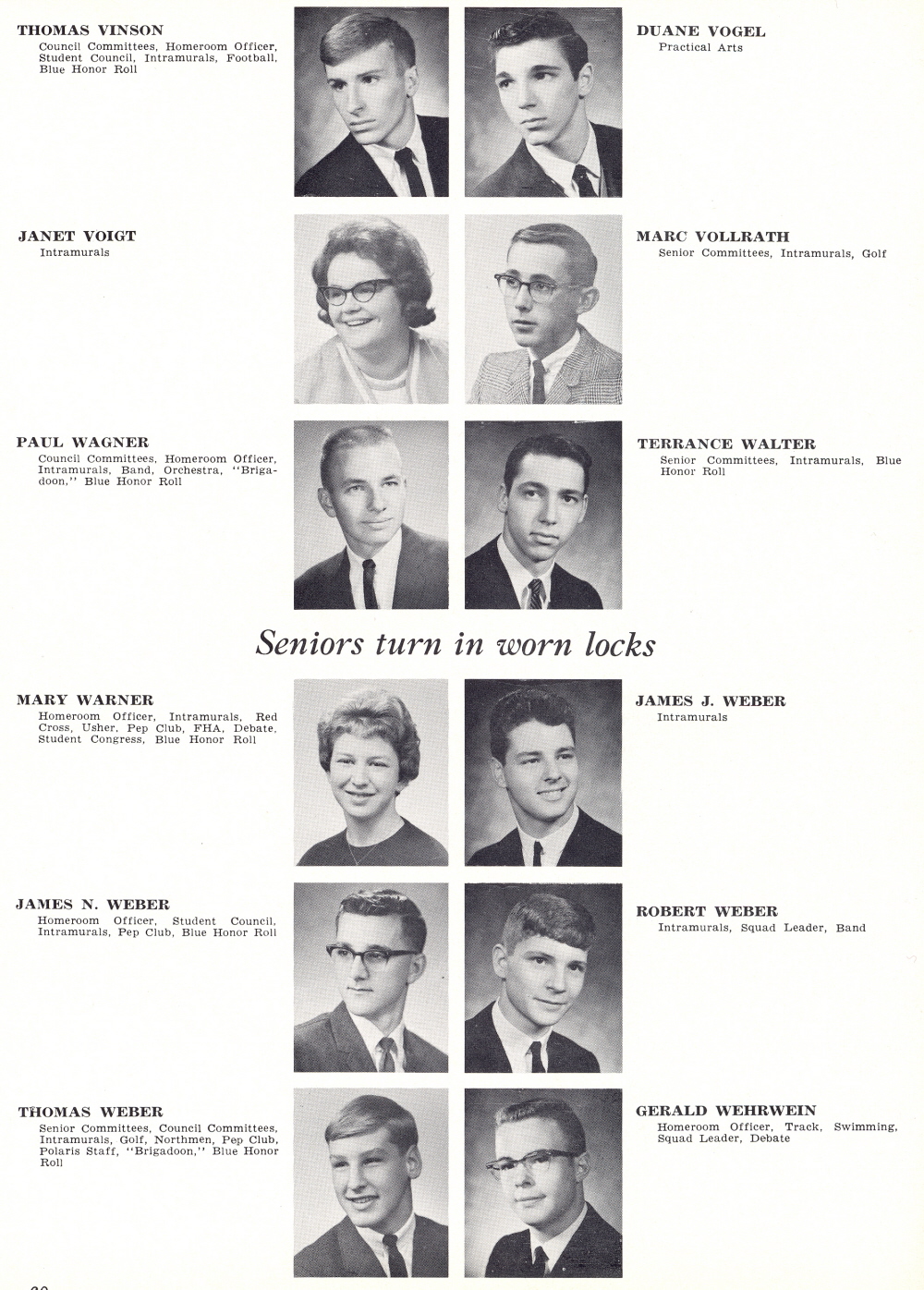 1965 Sheboygan North High School, Page 60: Thomas Vinson, Duane Vogel, Janet Voigt, Marc Vollrath, Paul Wagner, Terrance Walter, Mary Warner, James Weber, Rober Weber, Thomas Weber, Gerald Wehrwein.