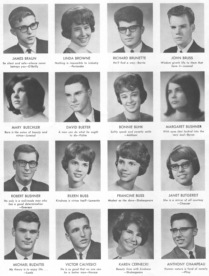 1965 Sheboygan South High School, Page 30: James Braun, Linda Browne, Richard Brunette, John Bruss, Mary Buechler, David Bueter, Bonnie Buhk, Margaret Bushner, Robert Bushner, Eileen Buss, Francine Buss, Janet Butgereit, Michael Buzaitis, Victor Calvesio, Karen Cernecki, Anthony Champeau.